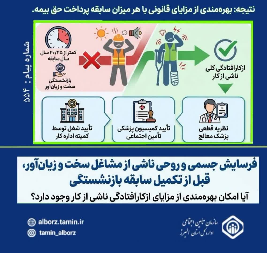 اگر به دلیل انجام کار سخت و زیانآور دچار فرسایش جسمی یا روحی شدهاید، حتی بدون داشتن سابقه ۲۰ یا ۲۵ سال، میتوانید مشمول کارافتادگی کلی ناشی از کار شوید؛ مشروط بر اینکه سه شرط زیر احراز شود: