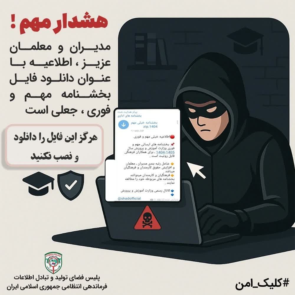 مدیران و فرهنگیان عزیز ، اطلاعیه با عنوان مطالعه فایل مربوط به بخشنامه مهم و فوری، جعلی است. هرگز این فایل ها را دانلود و نصب ننمایید. برای کسب اطلاعات بیشتر و صحت سنجی ابلاغیه ها و دستورالعمل ها و همچنین بخشنامه ها حتما به صورت حضوری به اداره آموزش و پرورش ناحیه خود مراجعه و اطمینان حاصل نمایید.