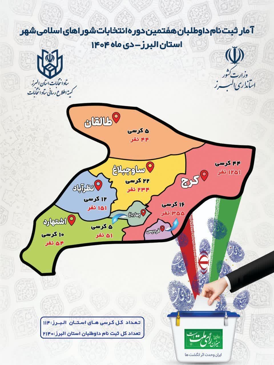 پراکنش وضعیت کرسی های شورای اسلامی شهر در استان البرز و میزان ثبت نام کنندگان به ازای هر کرسی