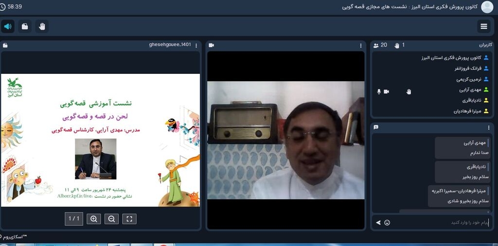 نشست مجازی آموزشی «لحن در قصه و قصهگویی» از مجموعه نشستهای ویژه همکاران برای حضور فعال در بیست و چهارمین جشنواره بینالمللی قصهگویی کانون در البرز برگزار شد .