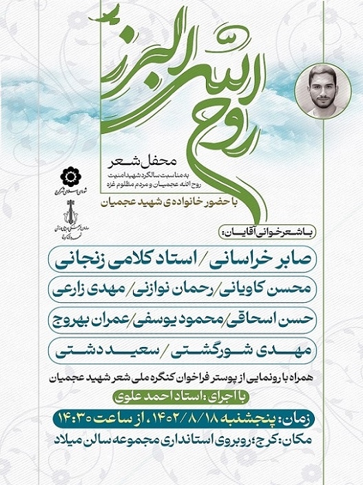 امیر اشتری معاون شهردار و رئیس سازمان فرهنگی اجتماعی ورزشی شهرداری کرج ضمن اشاره به اولین سالگرد شهید مدافع امنیت سید روح الله عجمیان و لزوم گرامیداشت و تبیین شخصیت ایشان در بین عموم جامعه با برنامه های مختلف گفت: به همین جهت سازمان فرهنگی شهرداری کرج در نظر دارد برای اولین بار در کشور، رویداد ادبی و محفل شعری را به نام "روح الله البرز" با حضور شاعران مطرح آیینی کشور برگزار نماید.این مسئول ابراز داشت: محفل شعر روح الله البرز در روز پنجشنبه ۱۸ آبان ماه ساعت ۱۵ در بلوار ماهان، مجموعه فرهنگی میلاد شهرداری کرج برگزار می گردد و از شاعران مطرح این رویداد فرهنگی ادبی میتوان به استاد ولی الله کلامی زنجانی، صابر خراسانی، حسن اسحاقی، رحمان نوازانی، محسن کاویانی، مهدی زارعی، محمود یوسفی، عمران بهروج، مهدی شورگشتی و سعید دشتی و اجرای استاد احمد علوی مجری توانمند عرصه شعر و هنر اشاره نمود.اشتری ضمن دعوت از تمامی شهروندان و عموم مردم البرز جهت حضور در این محفل شعر افزود: سازمان فرهنگی شهرداری کرج در "هفته ملی آرمان روح الله" نیز برنامه های متعددی را برگزار نمود که از جمله آنها میتوان به رویداد هنری و کارگاه گرافیک فرزند روح الله، مشارکت در رونمایی از سردیس شهید عجمیان، برگزاری مراسم اولین سالگرد شهید اشاره کرد و تلاش خود را در نکوداشت یاد و نام شهدا، خانواده معزز شهدا و موضوعات ملی مذهبی به کار برده است.