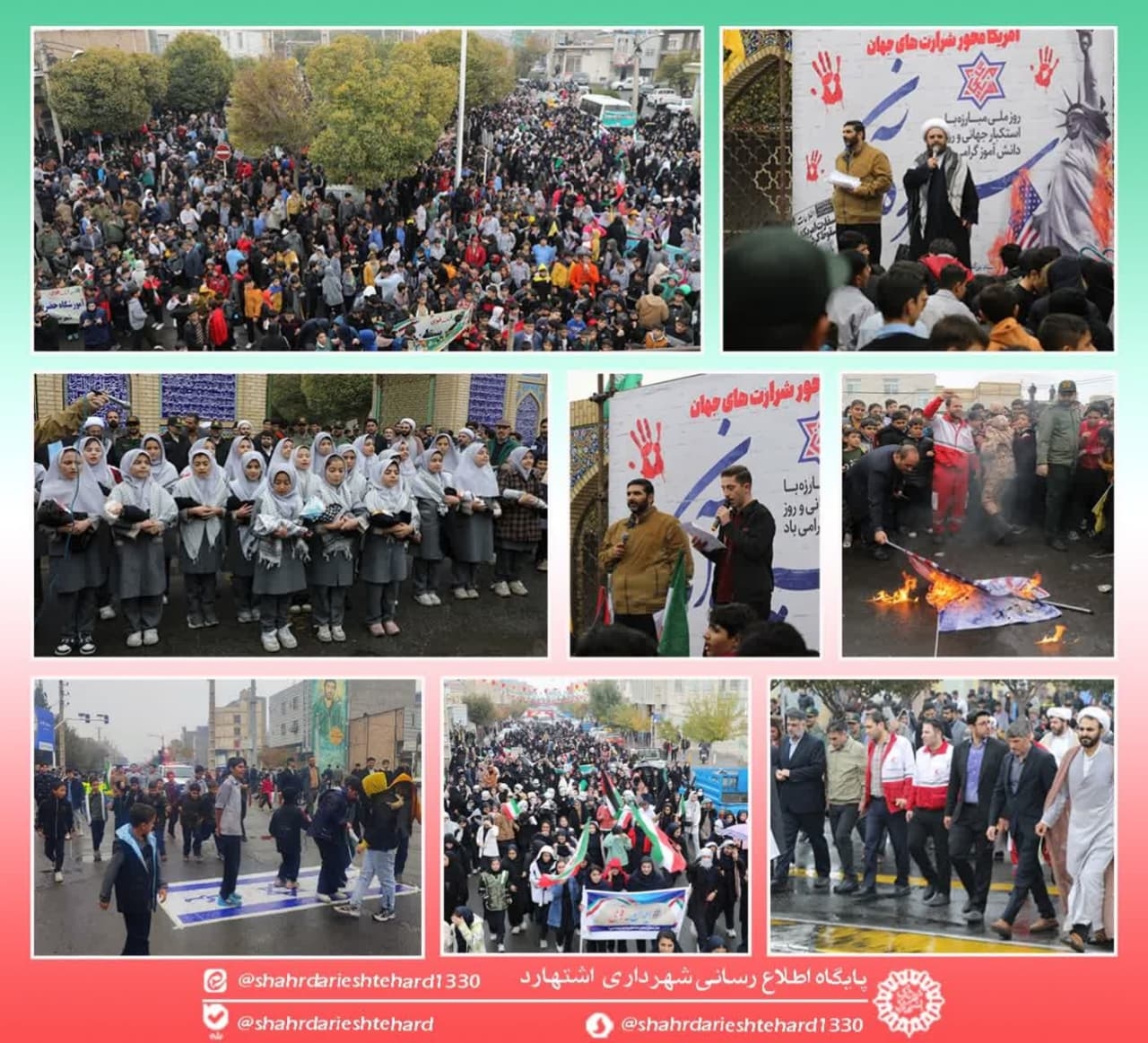 راهپیمایی ۱۳ آبان امروز با حضور مسئولان، معلمان، دانش آموزان و مردم همیشه در صحنه اشتهارد برگزار شد.