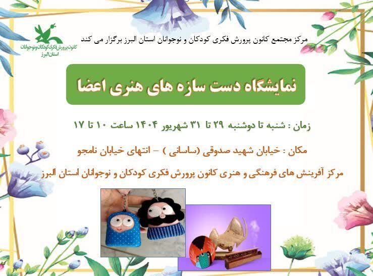 نمایشگاه و فروشگاه دستسازههای هنری اعضای مرکز مجتمع کانون پرورش فکری کودکان و نوجوانان استان البرز از ۲۹ تا ۳۱ شهریور ماه ۱۴۰۴ در این مرکز برپاست.