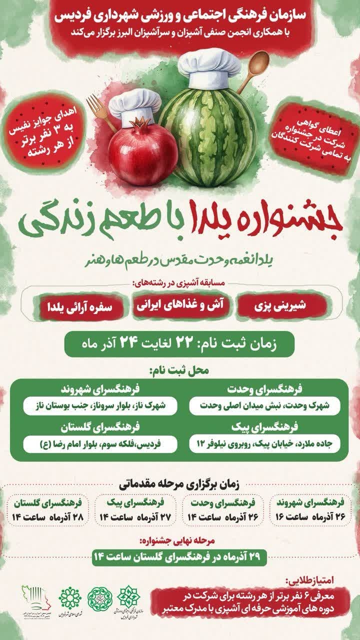 سازمان فرهنگی، اجتماعی و ورزشی شهرداری فردیس با همکاری انجمن صنفی آشپزان و سرآشپزان البرز، جشنواره بزرگ «یلدا با طعم زندگی» را همزمان با فرارسیدن شب یلدا برگزار میکند.