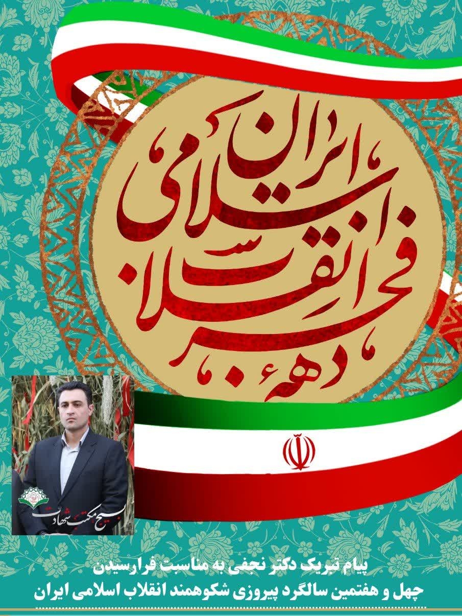 با فرارسیدن ایامالله مبارک دهه فجر، یادآور چهلوهفتمین سالگرد پیروزی شکوهمند انقلاب اسلامی و همچنین اعیاد فرخنده شعبانیه، این دو مناسبت بزرگ را به تمامی شما تبریک و تهنیت عرض مینمایم. دهه فجر نماد عزت، آزادی و استقلال ملتی است که با همت و ارادهای راسخ، به مبارزه علیه ظلم و ستم برخاست و به پیروزی رسید. این ایام فرصتی است تا با تجدید عهد با آرمانهای انقلاب، یاد و خاطره شهدای گرانقدر را گرامی بداریم و در راستای تحقق اهداف بلند انقلاب اسلامی گام برداریم.
