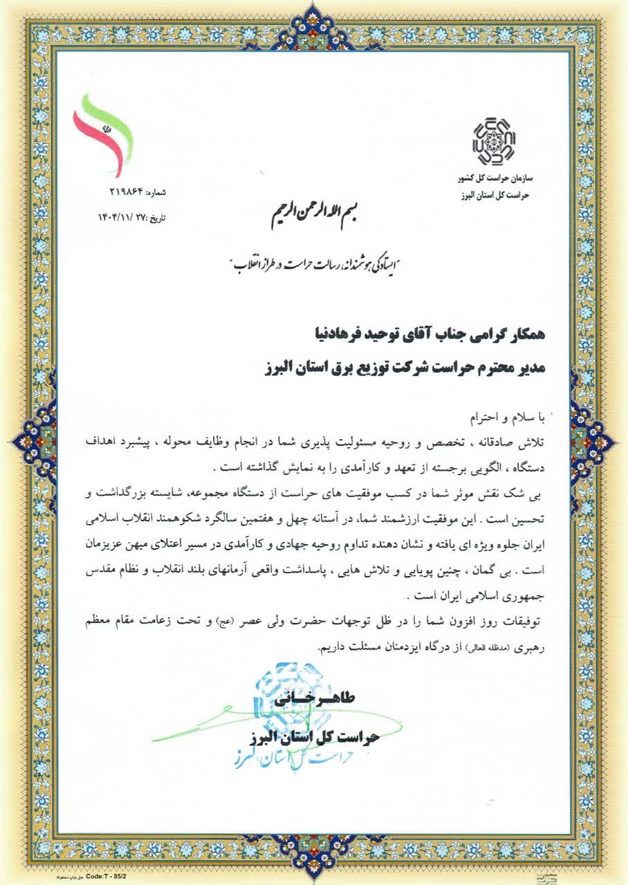 تلاش صادقانه، تخصص و روحیه مسئولیت پذیری شما در انجام وظایف محوله، پیشبرد اهداف دستگاه، الگویی برجسته از تعهد و کارآمدی را به نمایش گذاشته است. بی شک نقش موثر شما در کسب موفقیت های حراست از دستگاه مجموعه، شایسته بزرگداشت و تحسین است. این موفقیت ارزشمند شما در آستانه چهل و هفتمین سالگرد شکوهمند انقلاب اسلامی ایران جلوه ویژه ای یافته و نشان دهنده تداوم روحیه جهادی و کارآمدی در مسیر اعتلای میهن عزیزمان است. بی گام چنین پویایی و تلاش هایی پاسداشت واقعی آرمان های بلند انقلاب و نظام مقدس جمهوری اسلامی ایران است. توفیقات روز افزون شما را در ظل توجهات حضرت ولی عصر(عج) و تحت زعامت مقام معظم رهبری (مدظله العالی) از درگاه ایزد منان مسئلت داریم.