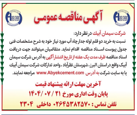 16 مهر 1404 شماره خبر: 332437 آگهی مناقصه عمومی شرکت سیمان آبیک سپیدارآنلاین: گروه مزایده و مناقصه آگهی مناقصه عمومی شرکت سیمان آبیک روزنامه پیام سپیدار شماره 2705 منتشر شد. نسخه قابل چاپ برچسب ها: آگهی مناقصه عمومی شرکت سیمان آبیک روزنامه پیام سپیدار شماره 2705 منتشر شد. مطالب مشابه: آگهی مناقصه عمومی شرکت سیمان آبیک آگهی مناقصه عمومی شرکت سیمان آبیک روزنامه پیام سپیدار آگهی مناقصه شرکت سیمان آبیک آگهی تجدید مناقصه عمومی شرکت سیمان آبیک آگهی مناقصه شرکت سیمان آبیک