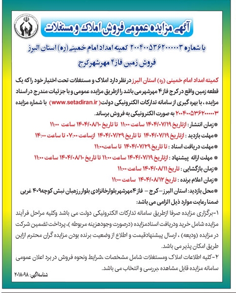 آگهی مزایده عمومی فروش املاک و مشتغلات شماره 2004005362000003 کمیته امداد امام خمینی ره البرز
