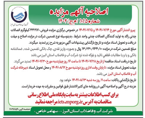 اصلاحیه اگهی مزایده شماره m5 / م ج / 1404 شرکت آب و فاضلاب استان البرز