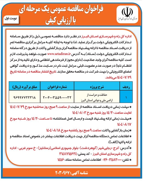 فراخوان مناقصه عمومی یک مرحله ای با ارزیابی کیفی اداره کل راه و شهرسازی البرز