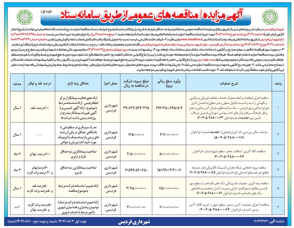 آگهی مزایده / مناقصه های عمومی از طریق سامانه ستاد شهرداری فردیس روزنامه پیام سپیدار شماره 2716 منتشر شد.
