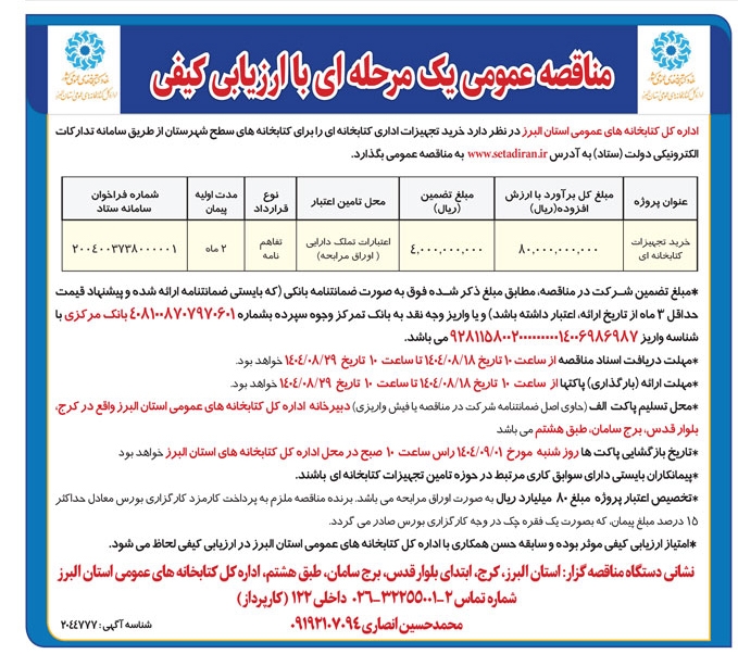 آگهی مناقصه عمومی یک مرحله ای با ارزیابی کیفی اداره کل کتابخانه های عمومی استان البرز