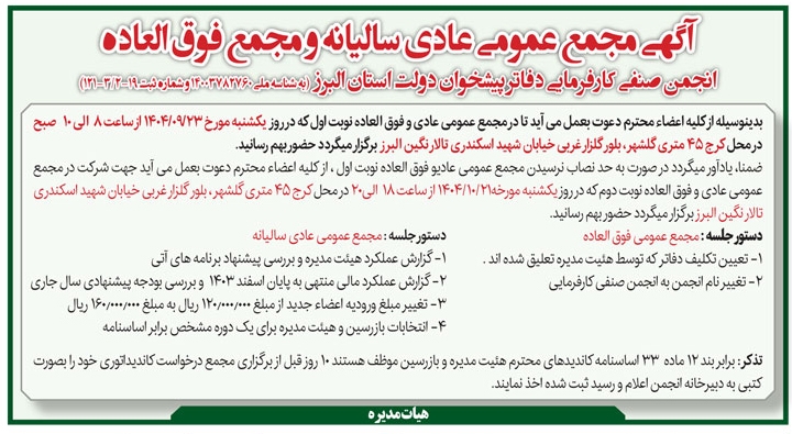 آگهی مجمع عمومی عادی و سالیانه و مجمع فوق العاده انجمن صنفی کارفرمایی دفاتر پیشخوان استان البرز