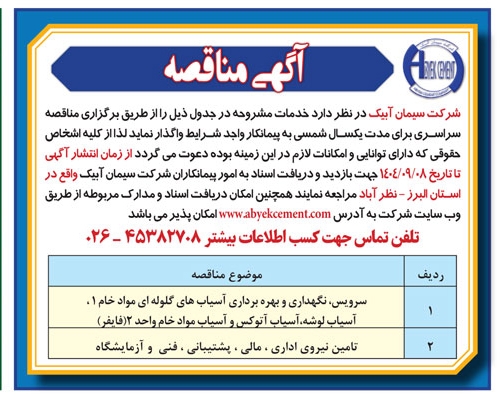 27 آبان 1404 شماره خبر: 335291 آگهی مناقصه شرکت سیمان آبیک سپیدارآنلاین: گروه مزایده و مناقصه آگهی مناقصه شرکت سیمان آبیک روزنامه پیام سپیدار شماره 2734 منتشر شد. نسخه قابل چاپ برچسب ها: آگهی مناقصه شرکت سیمان آبیک روزنامه پیام سپیدار شماره 2734 منتشر شد. مطالب مشابه: روزنامه پیام سپیدار آگهی مناقصه شرکت سیمان آبیک آگهی مناقصه شرکت سیمان آبیک آگهی مناقصه شرکت سیمان آبیک آگهی مناقصه عمومی شرکت سیمان آبیک آگهی مناقصه عمومی شرکت سیمان آبیک