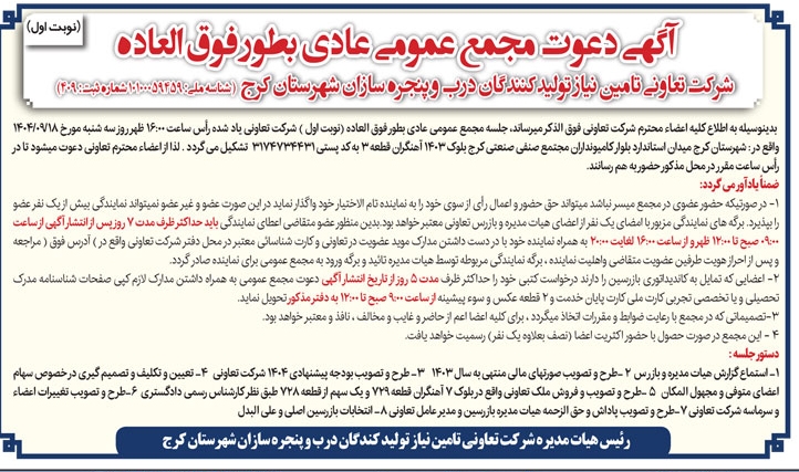 آگهی دعوت مجمع عمومی عادی بطور فوق العاده شرکت تعاونی تامین نیاز تولیدکنندگان درب و پنجره سازان شهرستان کرج
