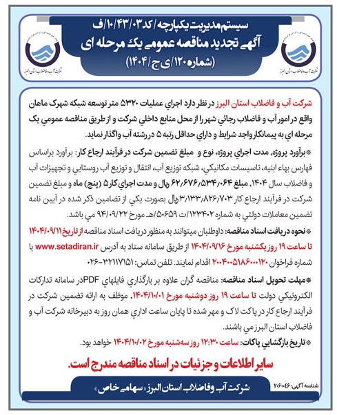 آگهی تجدید مناقصه عمومی یک مرحله ای شماره 120/ ی ج /1404 شرکت آب و فاضلاب استان البرز