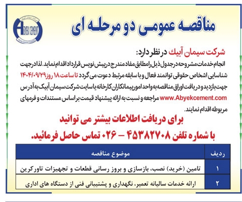15 آذر 1404 شماره خبر: 336386 آگهی مناقصه عمومی دو مرحله ای شرکت سیمان آبیک سپیدارآنلاین: گروه مزایده و مناقصه آگهی مناقصه عمومی دو مرحله ای شرکت سیمان آبیک روزنامه پیام سپیدار شماره 2745 منتشر شد. نسخه قابل چاپ برچسب ها: آگهی مناقصه عمومی دو مرحله ای شرکت سیمان آبیک روزنامه پیام سپیدار شماره 2745 منتشر شد. مطالب مشابه: آگهی مناقصه عمومی شرکت سیمان آبیک آگهی مناقصه عمومی شرکت سیمان آبیک روزنامه پیام سپیدار آگهی مناقصه شرکت سیمان آبیک آگهی تجدید مناقصه عمومی شرکت سیمان آبیک آگهی مناقصه شرکت سیمان آبیک