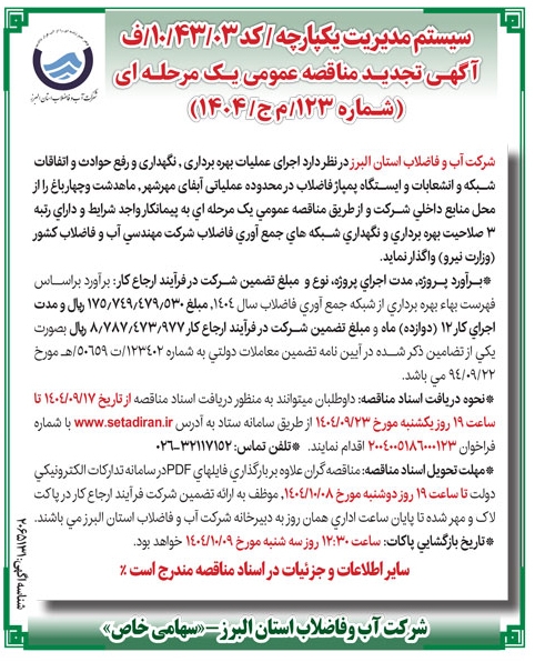 آگهی تجدید مناقصه عمومی یک مرحله ای شماره 123/ م ج /1404 شرکت آب و فاضلاب استان البرز