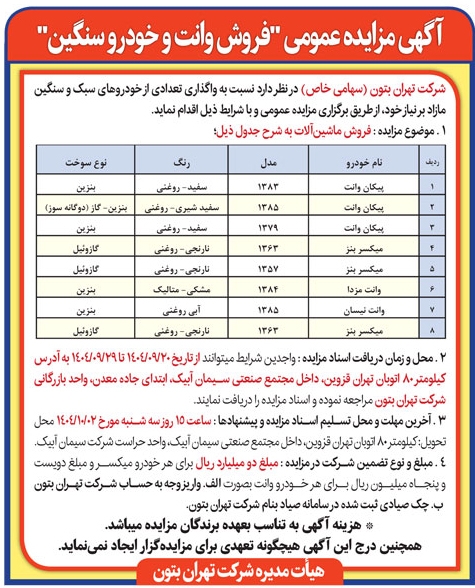 19 آذر 1404 شماره خبر: 336748 آگهی مزایده عمومی "فروش وانت و خودرو سنگین"شرکت تهران بتون سپیدارآنلاین: گروه مزایده و مناقصه آگهی مزایده عمومی "فروش وانت و خودرو سنگین"شرکت تهران بتون روزنامه پیام سپیدار شماره 2749 منتشر شد. نسخه قابل چاپ برچسب ها: آگهی مزایده عمومی فروش وانت و خودرو سنگینشرکت تهران بتون روزنامه پیام سپیدار شماره 2749 منتشر شد. مطالب مشابه: روزنامه پیام سپیدار آگهی مزایده عمومی آگهی مزایده اقلام مستعمل و ضایعاتی شرکت تهران بتون روزنامه پیام سپیدار آگهی مزایده عمومی آگهی مزایده فروش عمومی یک دستگاه خودرو شرکت عمران شهر مهستان به شماره 01-06-1404 خ روزنامه پیام سپیدار آگهی مزایده عمومی