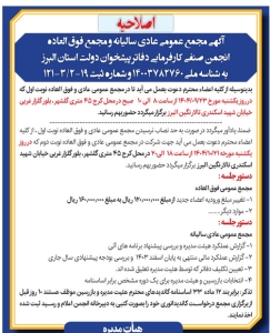 اصلاحیه آگهی مجمع عمومی عادی سالیانه و مجمع فوق العاده انجمن صنفی کارفرمایی دفاتر پیشخوان دولت استان البرز