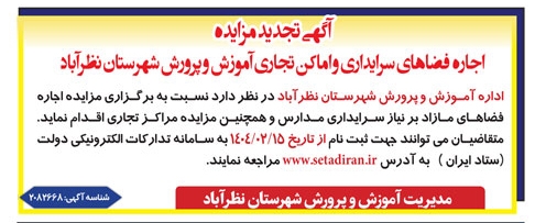 آگهی تجدید مزایده اجاره فضاهای سرایداری و اماکن تجاری آموزش و پرورش شهرستان نظرآباد