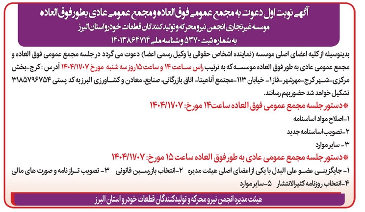 آگهی دعوت به مجمع عمومیموسسه غیرتجاری انجمن نیرو محرکه و تولیدکنندگان قطعات خودرو استان البرز