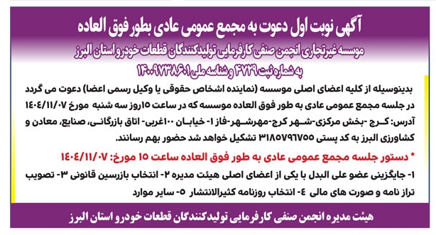 آگهی دعوت به مجمع موسسه غیرتجاری انجمن صنفی کارفرمایی تولیدکنندگان قطعات خودرو استان البرز