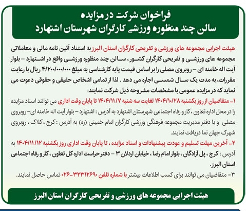• آگهی فراخوان شرکت در مزایده سالن چند منظوره ورزشی کارگران شهرستان اشتهارد