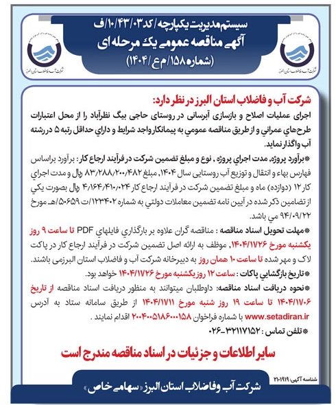 آگهی مناقصه عمومی یک مرحله ای شماره 158 / م ع/ 1404 شرکت آب و فاضلاب البرز