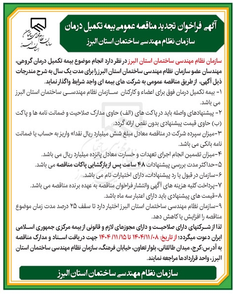 آگهی فراخوان تجدید مناقصه عمومی بیمه تکمیل درمان سازمان نظام مهندسی ساختمان استان البرز