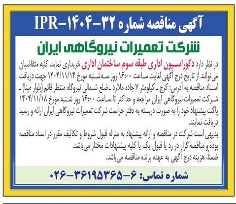 12 بهمن 1404 شماره خبر: 339105 آگهی مناقصه شماره IPR-1404-32 شرکت تعمیرات نیروگاهی ایران سپیدارآنلاین: گروه مزایده و مناقصه آگهی مناقصه شماره IPR-1404-32 شرکت تعمیرات نیروگاهی ایران روزنامه پیام سپیدار شماره 2784 منتشر شد. نسخه قابل چاپ برچسب ها: آگهی مناقصه شماره IPR-1404-32 شرکت تعمیرات نیروگاهی ایران روزنامه پیام سپیدار شماره 2784 منتشر شد. مطالب مشابه: آگهی مناقصه عمومی یک مرحله ای شماره 63 / ی ج /1404 شرکت آب و فاضلاب البرز آگهی مناقصه عمومی یک مرحله ای شماره 158 / م ع/ 1404 شرکت آب و فاضلاب البرز آگهی مناقصه عمومی یک مرحله ای شماره 161/ ی ع/ 1404 شرکت آب و فاضلاب البرز آگهی مناقصه عمومی یک مرحله ای شماره 70/ م ج /1404 شرکت آب و فاضلاب البرز آگهی مناقصه عمومی یک مرحله ای شماره 10/ ی ج/ 1404 شرکت آب و فاضلاب استان البرز