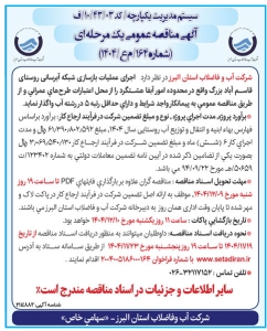 آگهی مناقصه عمومی یک مرحله ای شماره 164/ م ع/ 1404 شرکت آب و فاضلاب البرز