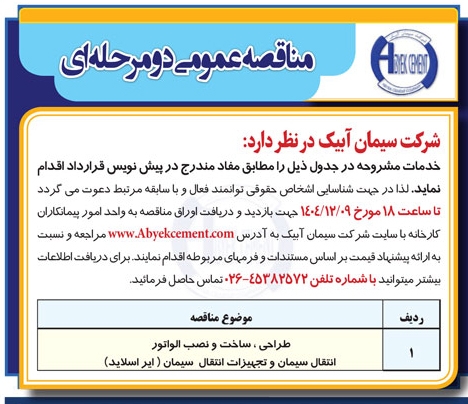 آگهی مناقصه سراسری دو مرحله ایی شرکت سیمان ابیک
