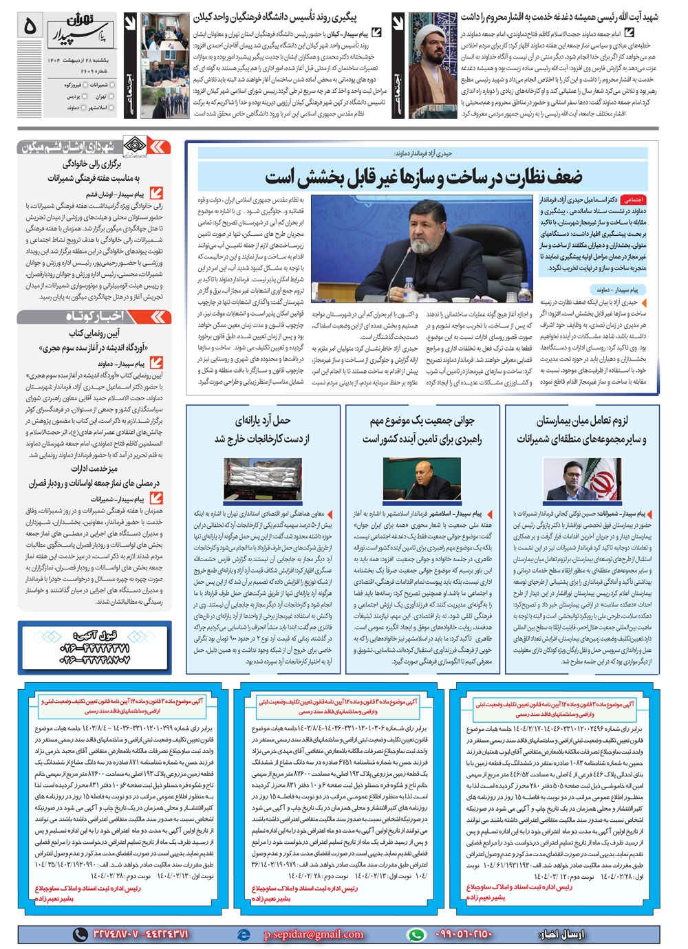 روزنامه پیام سپیدار شماره 2609 یکشنبه بیست و هشتم اردیبهشت سال هزارو چهارصدو چهار منتشر شد و در دسترس مخاطبین قرار گرفت. روزنامه پیام سپیدار را می توانید از کیوسک های مطبوعاتی سطح شهر تهیه کنید.