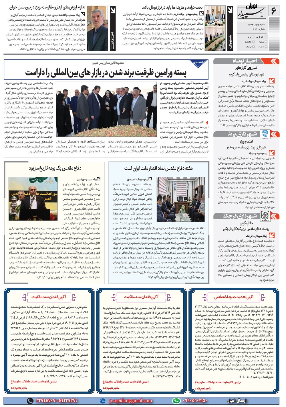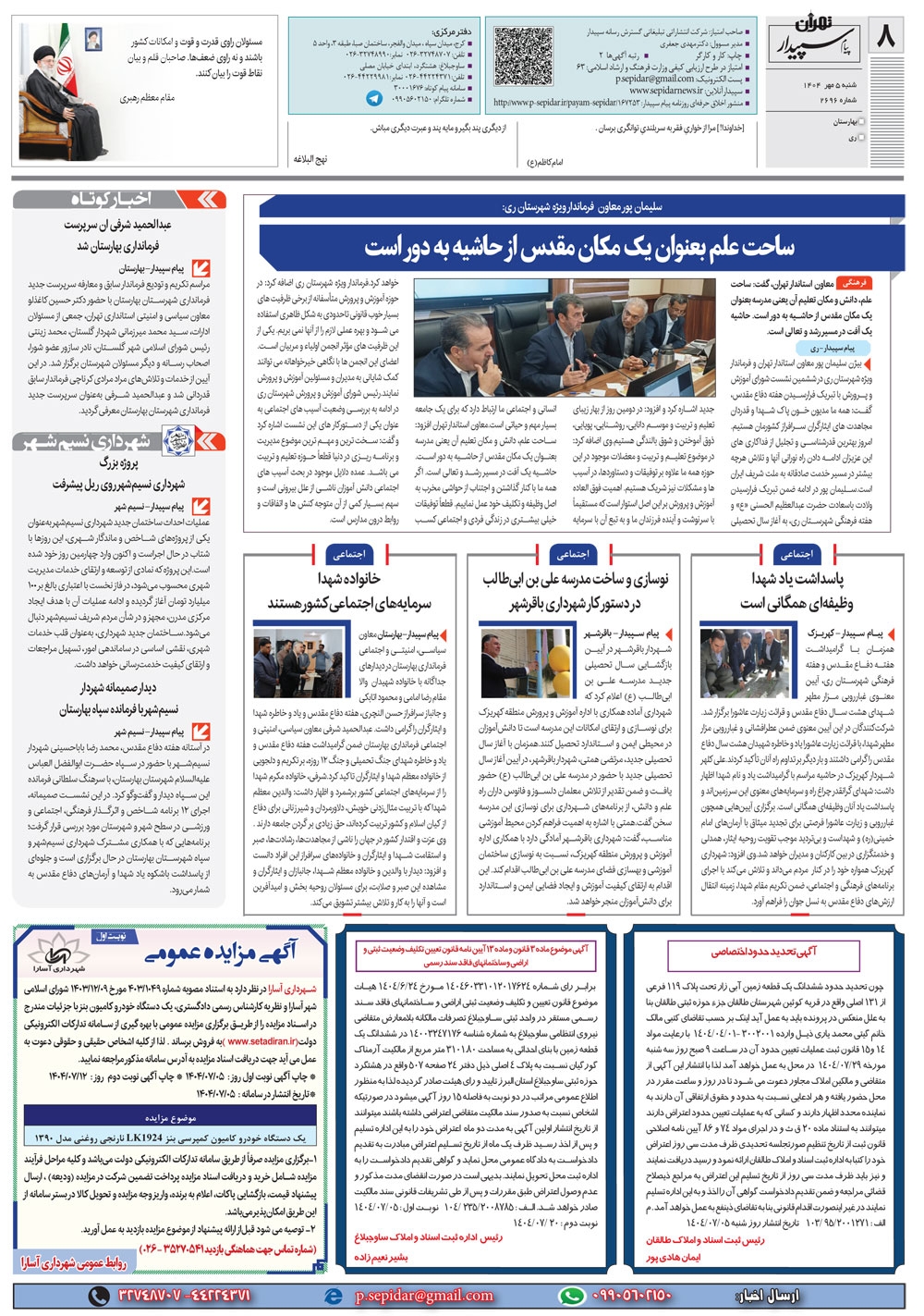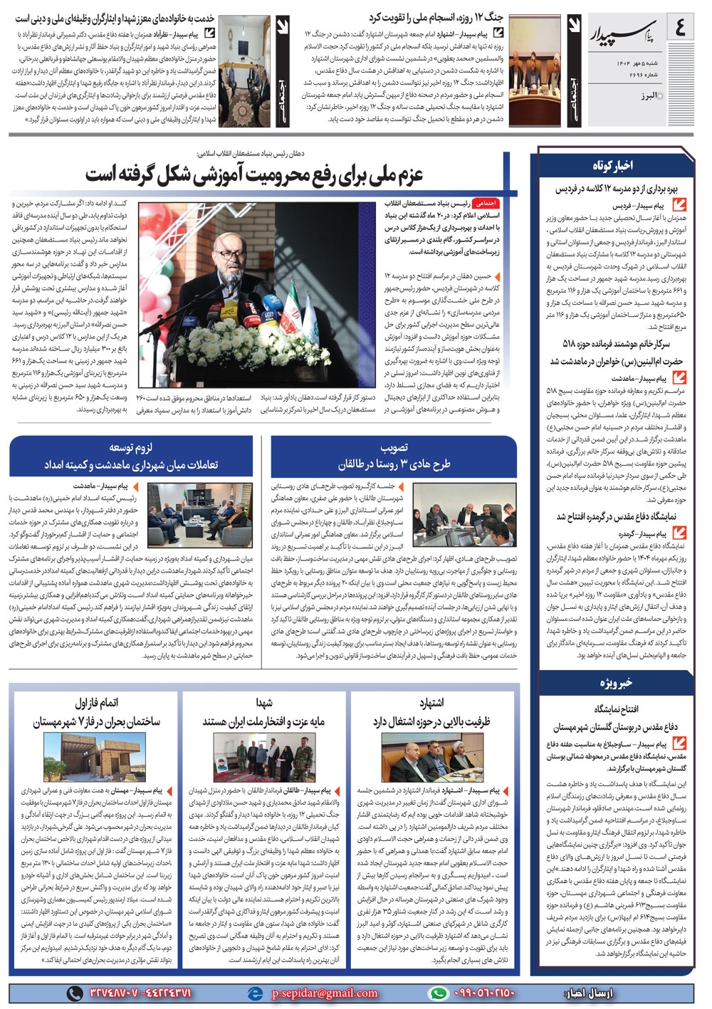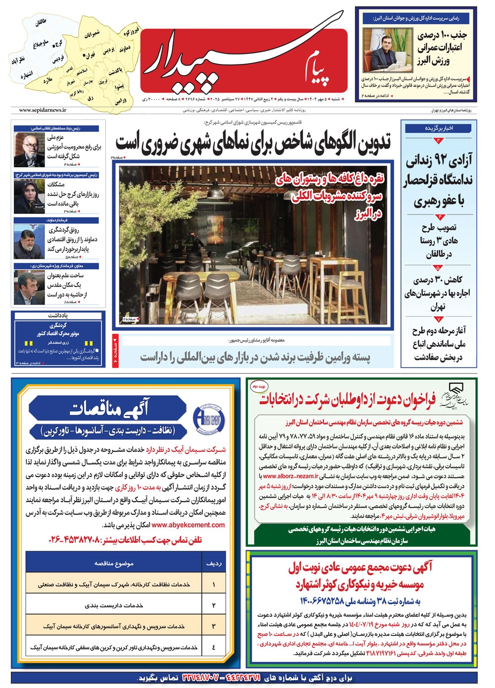روزنامه پیام سپیدار شماره 2696 شنبه پنجم مهر سال هزارو چهارصدو چهار منتشر شد و در دسترس مخاطبین قرار گرفت. روزنامه پیام سپیدار را می توانید از کیوسک های مطبوعاتی سطح شهر تهیه کنید.
