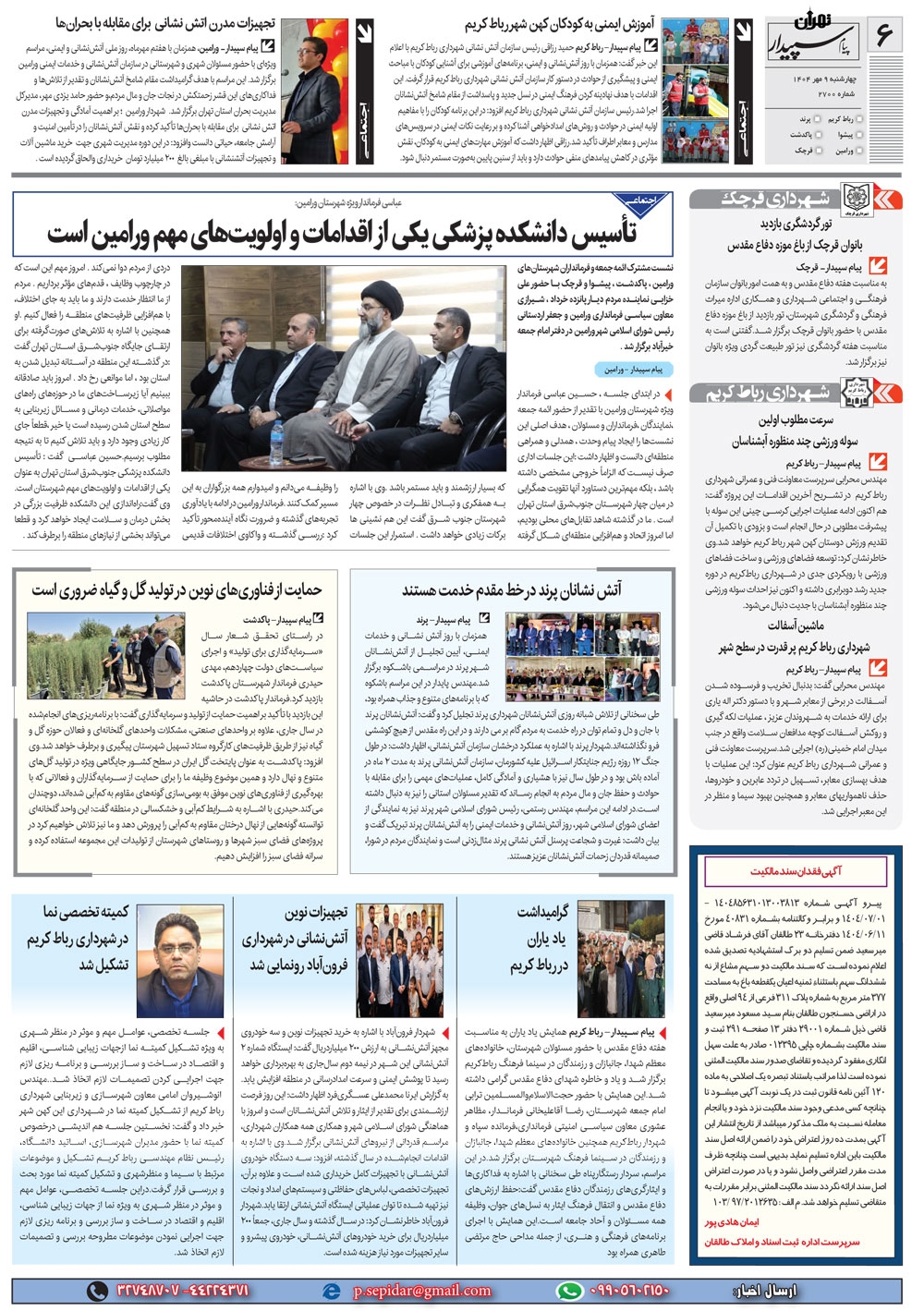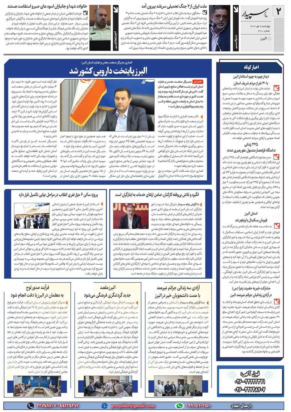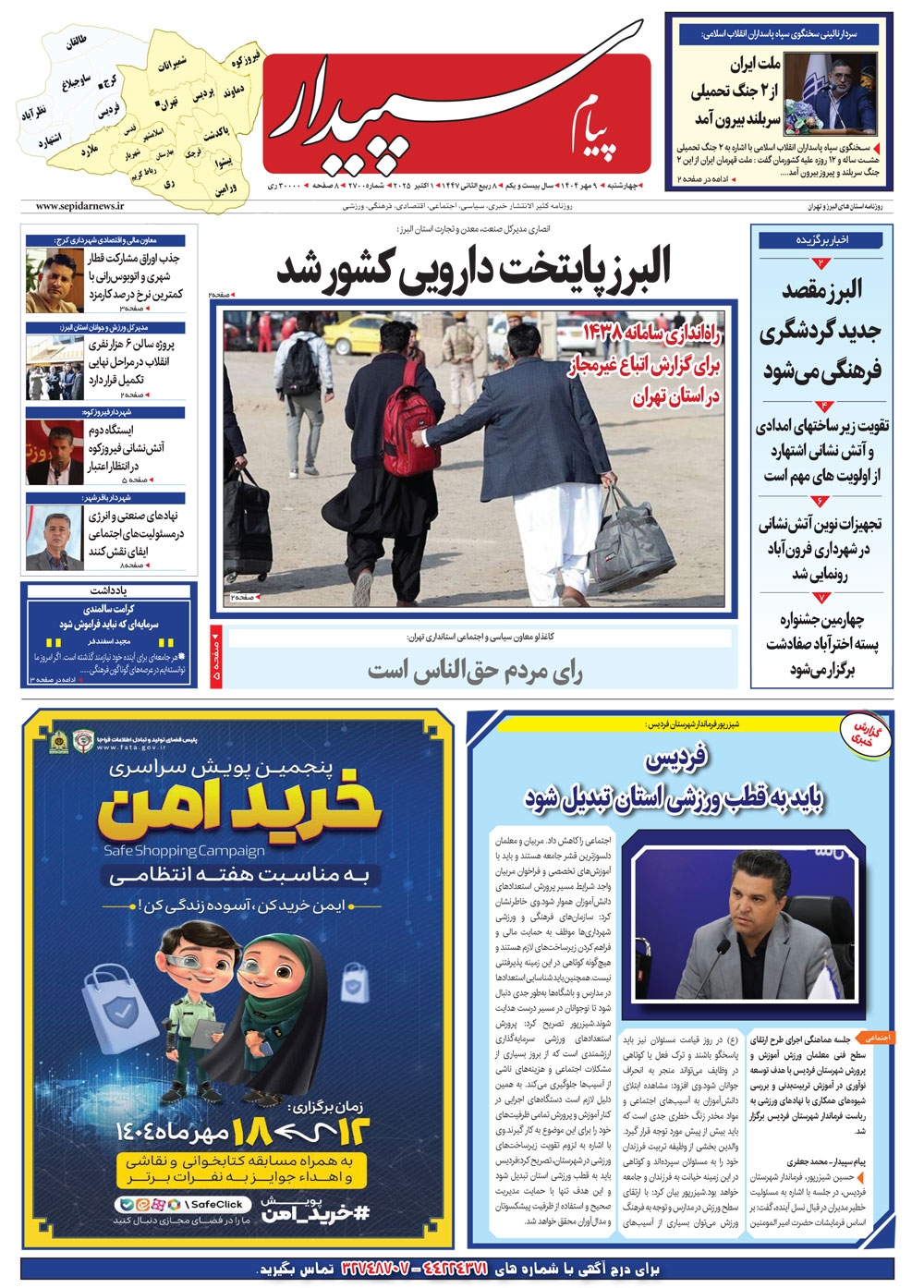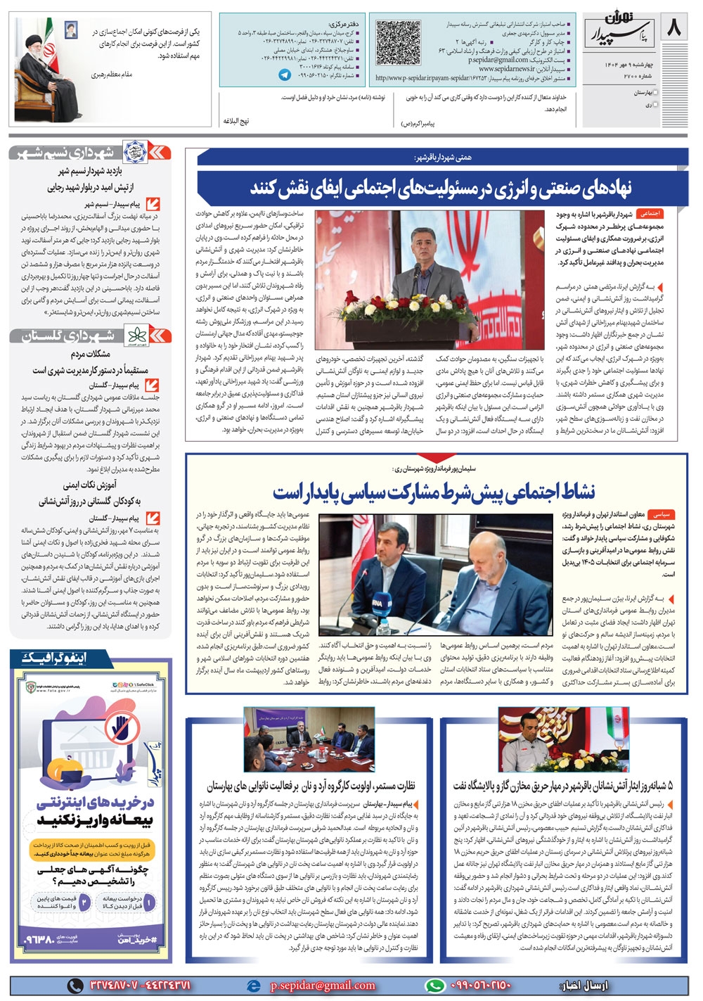 روزنامه پیام سپیدار شماره 2700 چهار شنبه نهم مهر سال هزارو چهارصدو چهار منتشر شد و در دسترس مخاطبین قرار گرفت. روزنامه پیام سپیدار را می توانید از کیوسک های مطبوعاتی سطح شهر تهیه کنید.