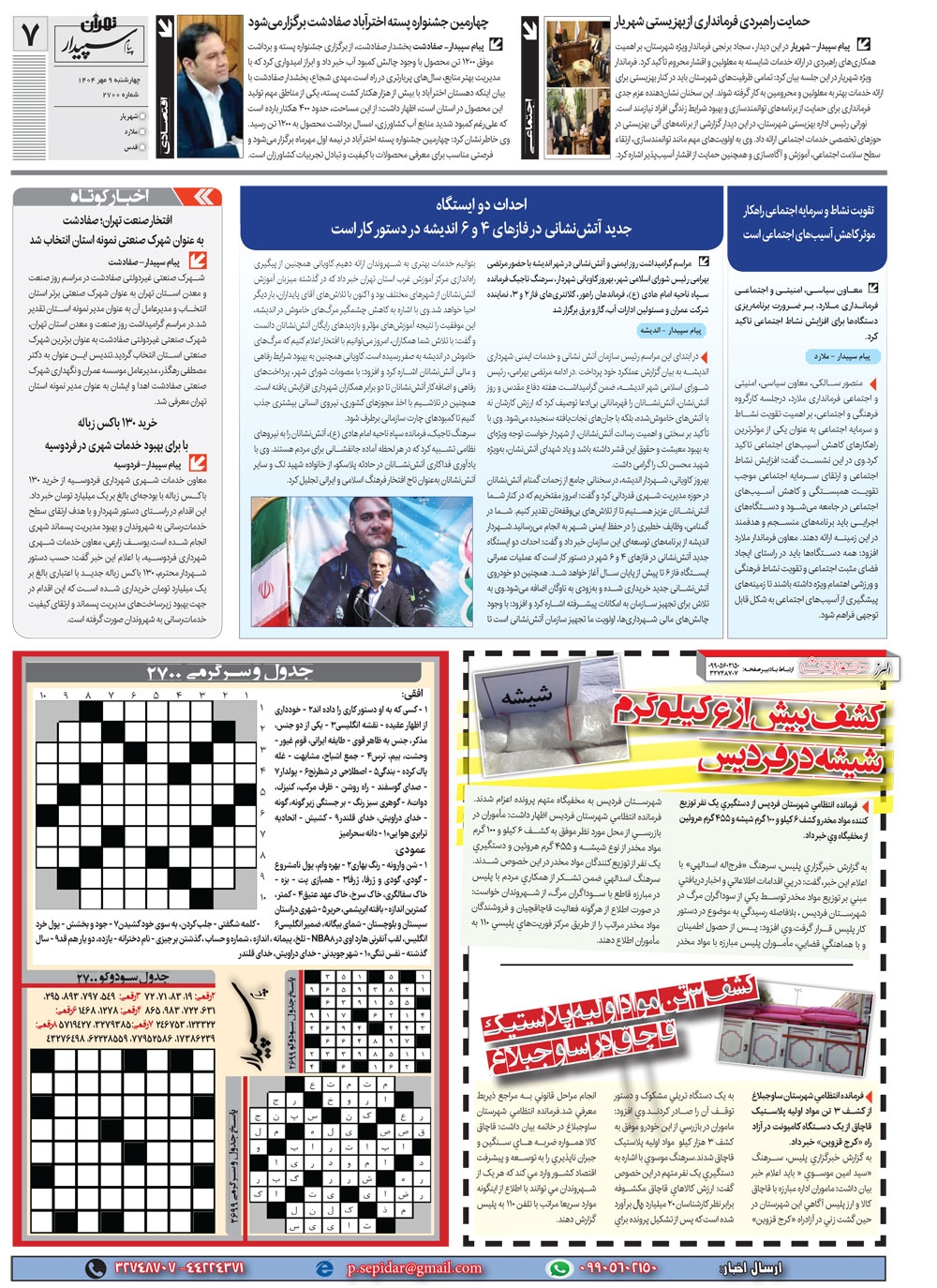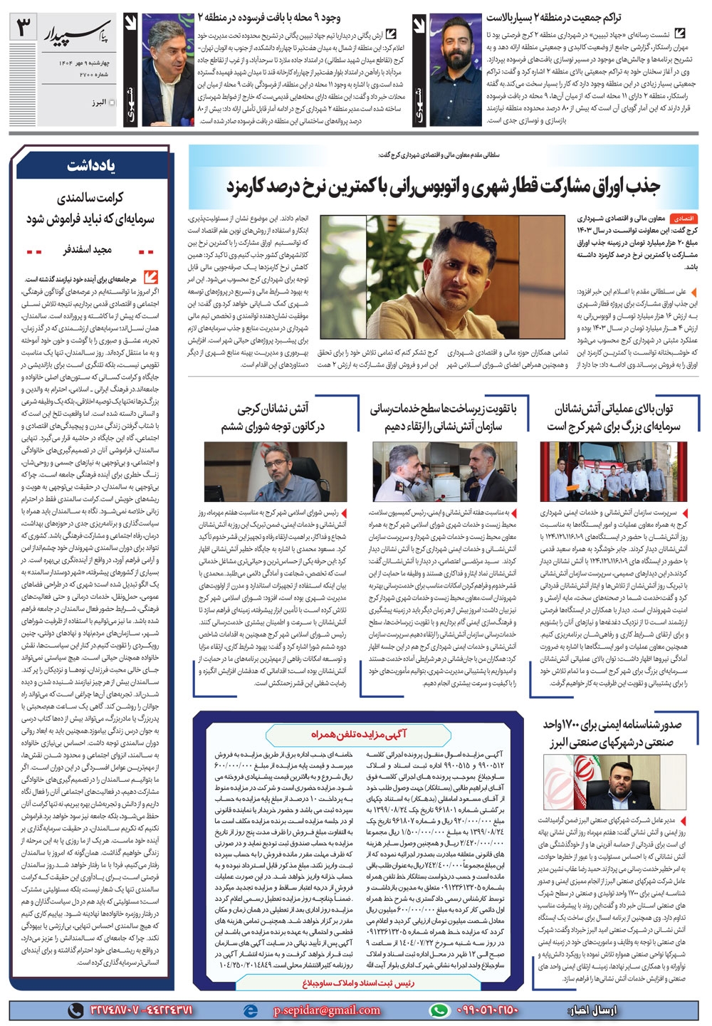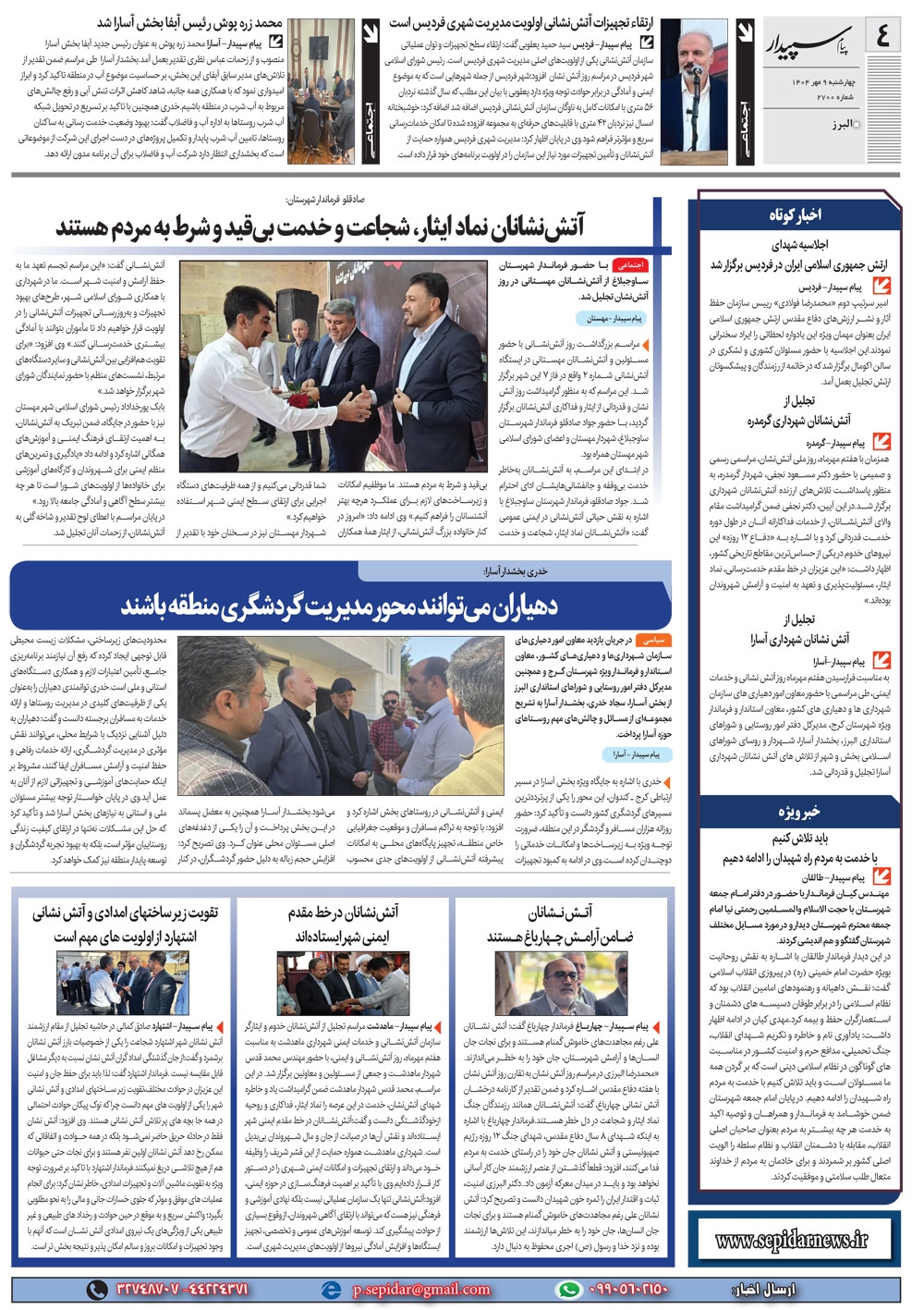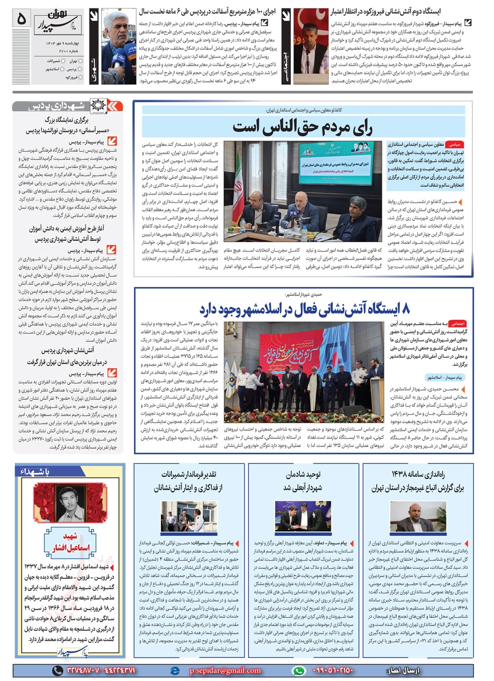 روزنامه پیام سپیدار شماره 2700 چهار شنبه نهم مهر سال هزارو چهارصدو چهار منتشر شد و در دسترس مخاطبین قرار گرفت. روزنامه پیام سپیدار را می توانید از کیوسک های مطبوعاتی سطح شهر تهیه کنید.