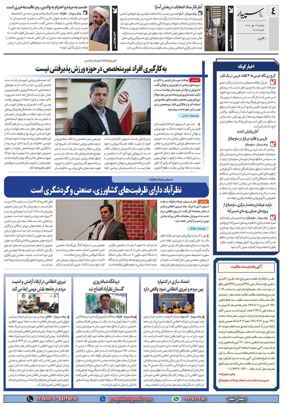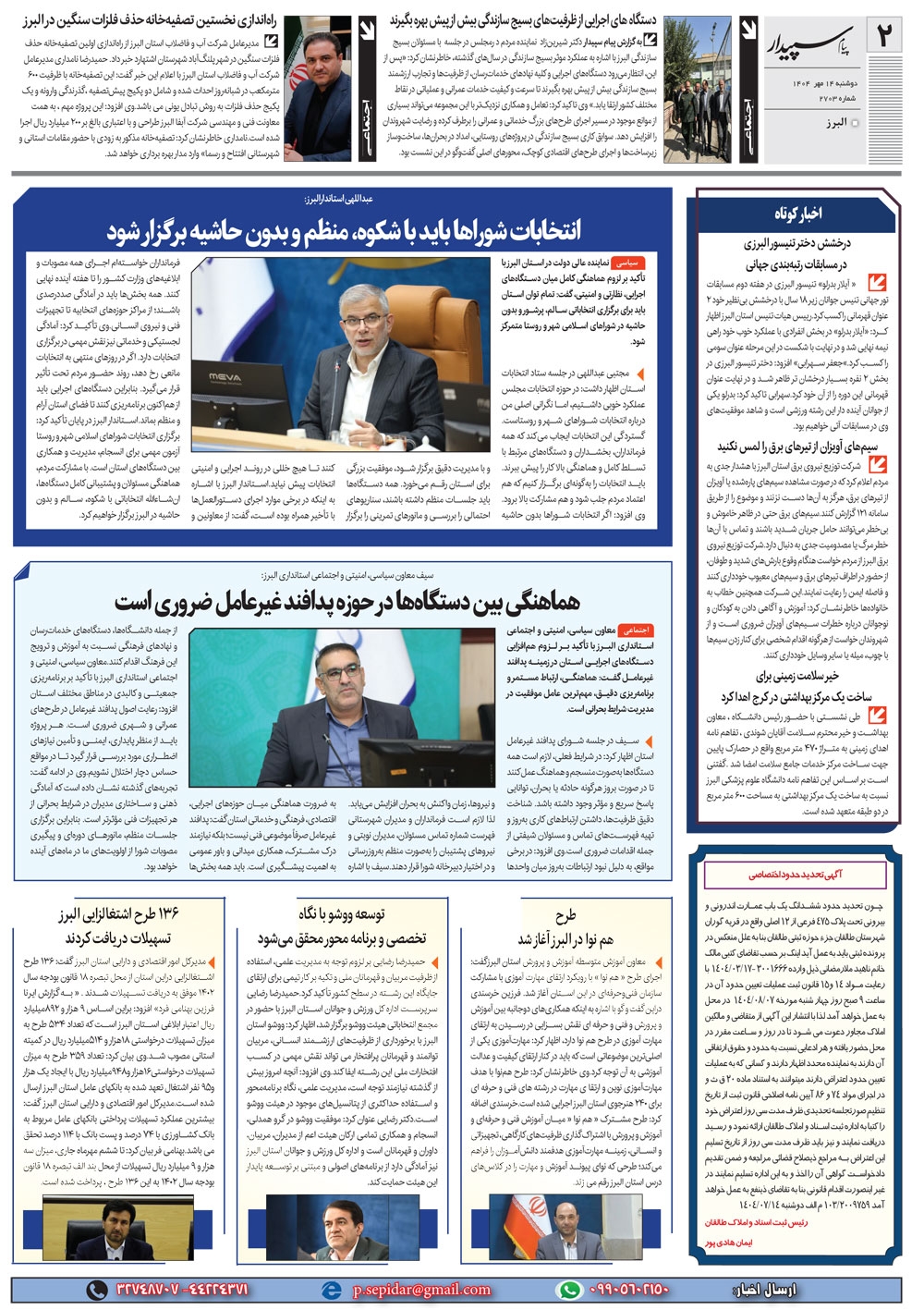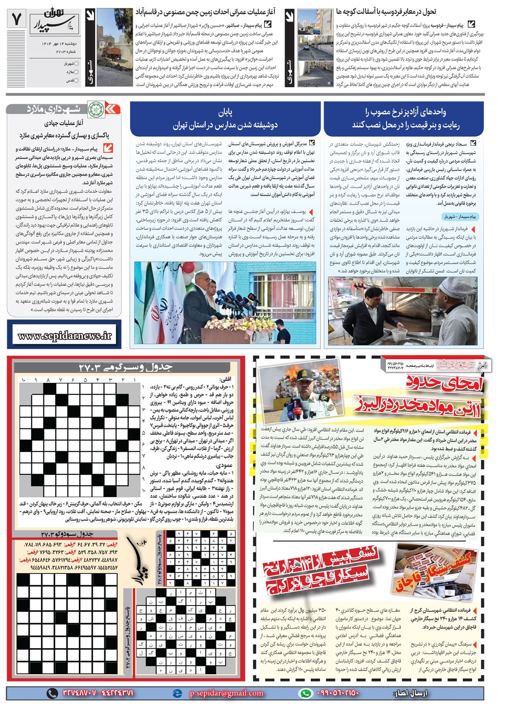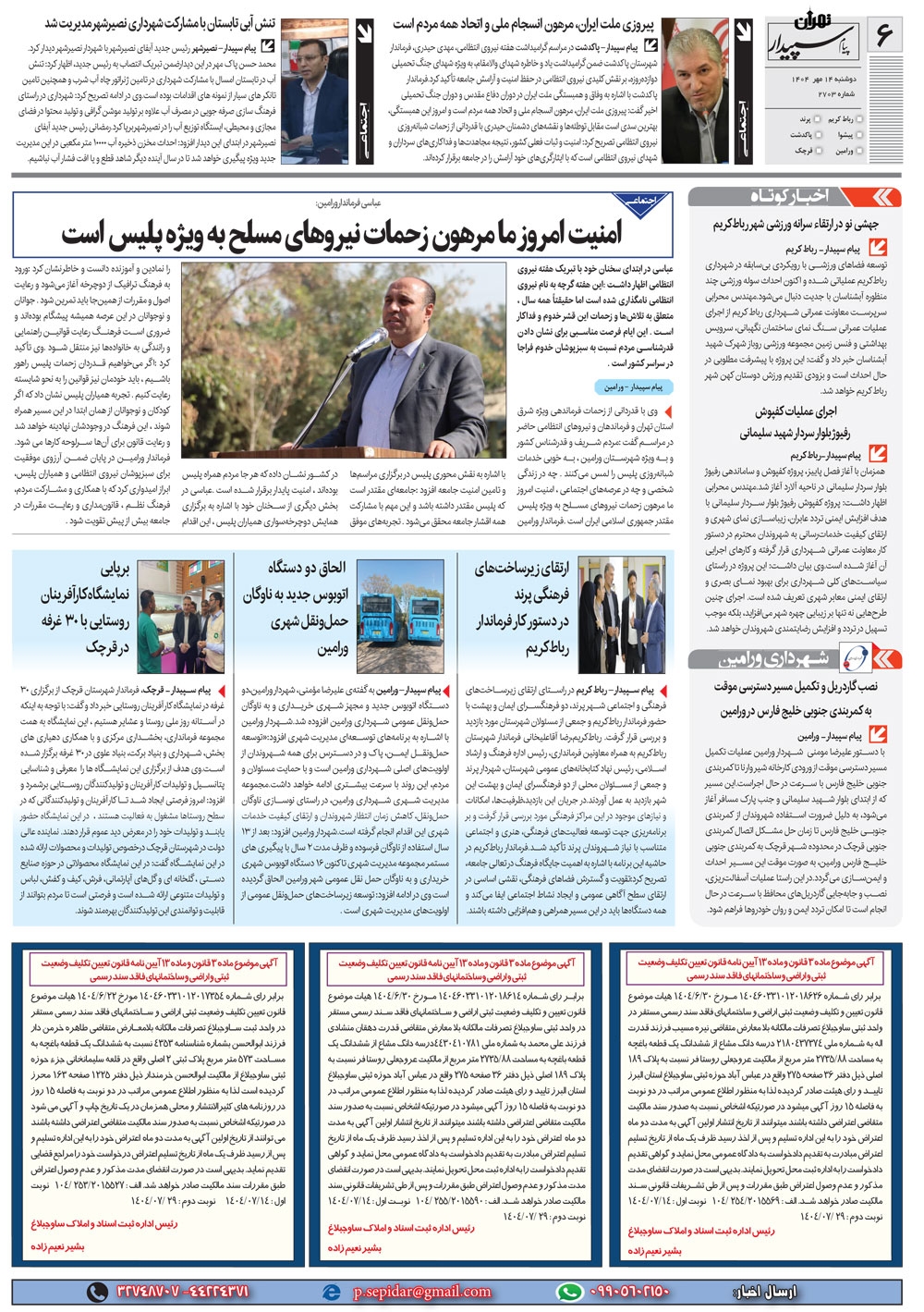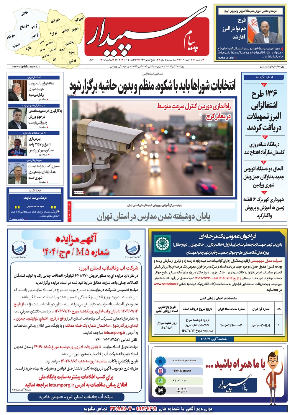 روزنامه پیام سپیدار شماره 2703 دوشنبه چهاردهم مهر سال هزارو چهارصدو چهار منتشر شد و در دسترس مخاطبین قرار گرفت. روزنامه پیام سپیدار را می توانید از کیوسک های مطبوعاتی سطح شهر تهیه کنید.