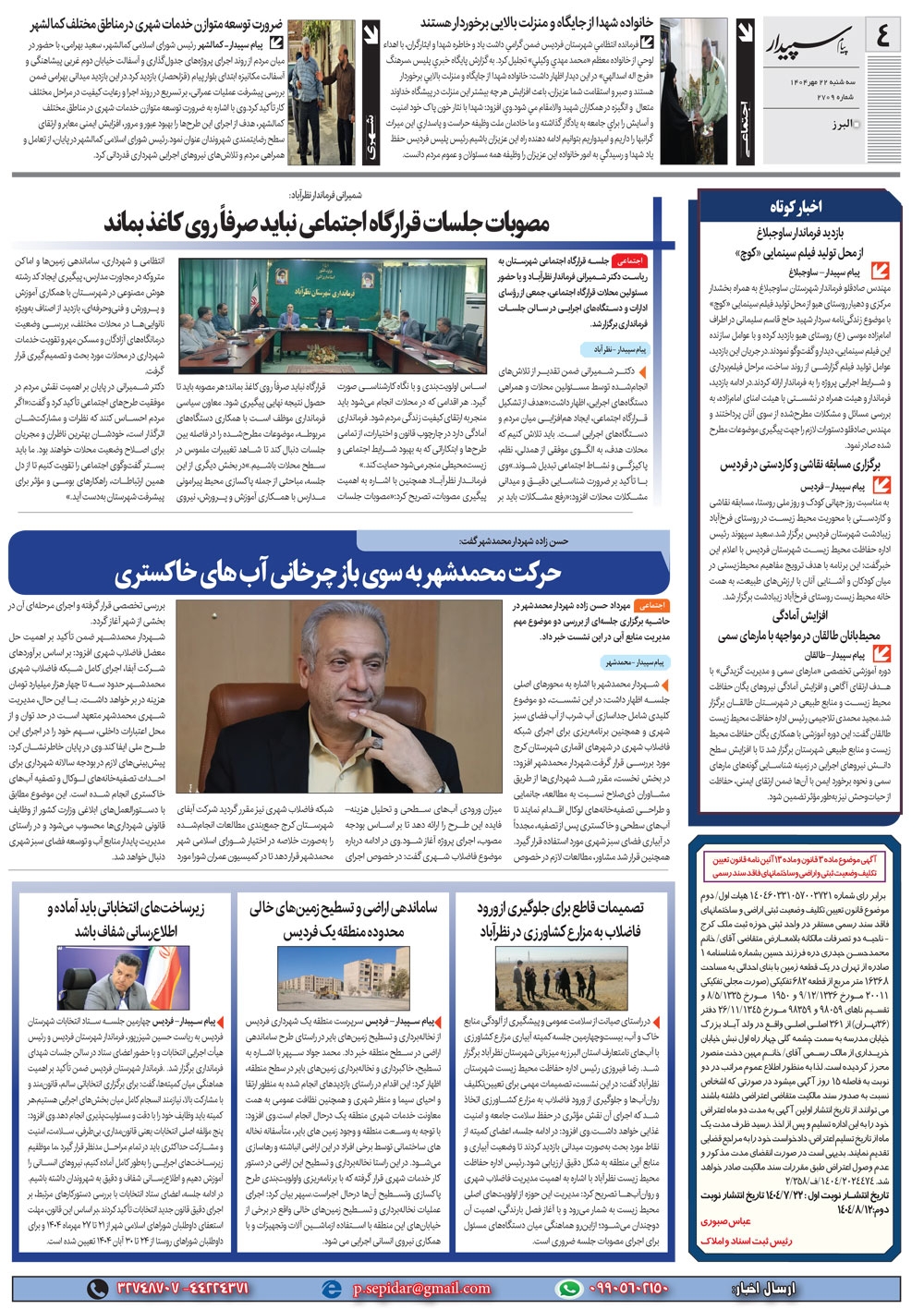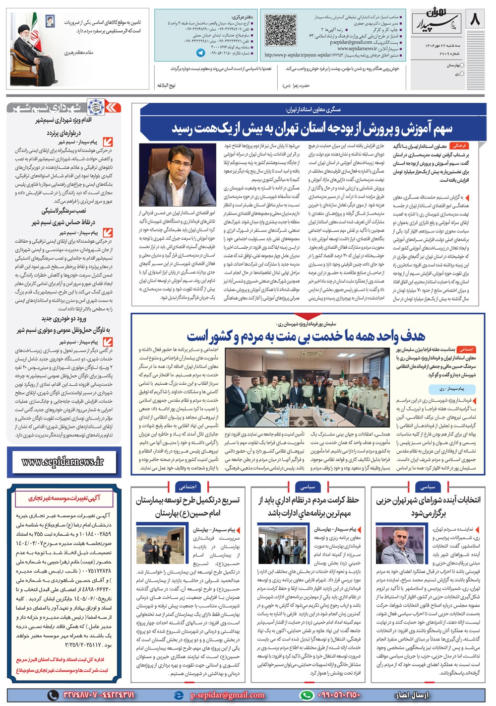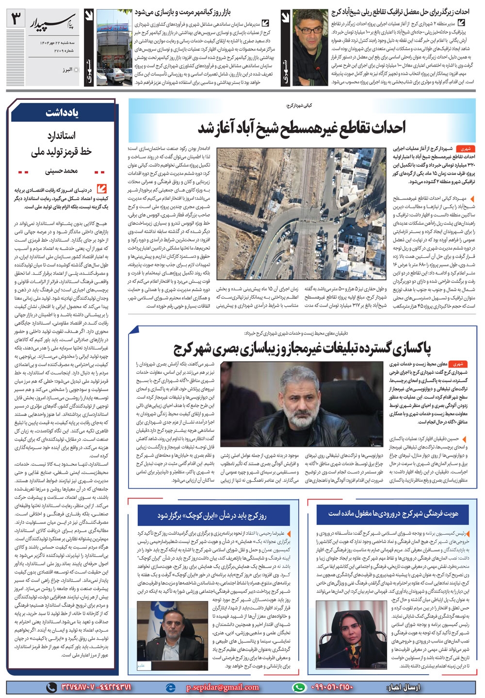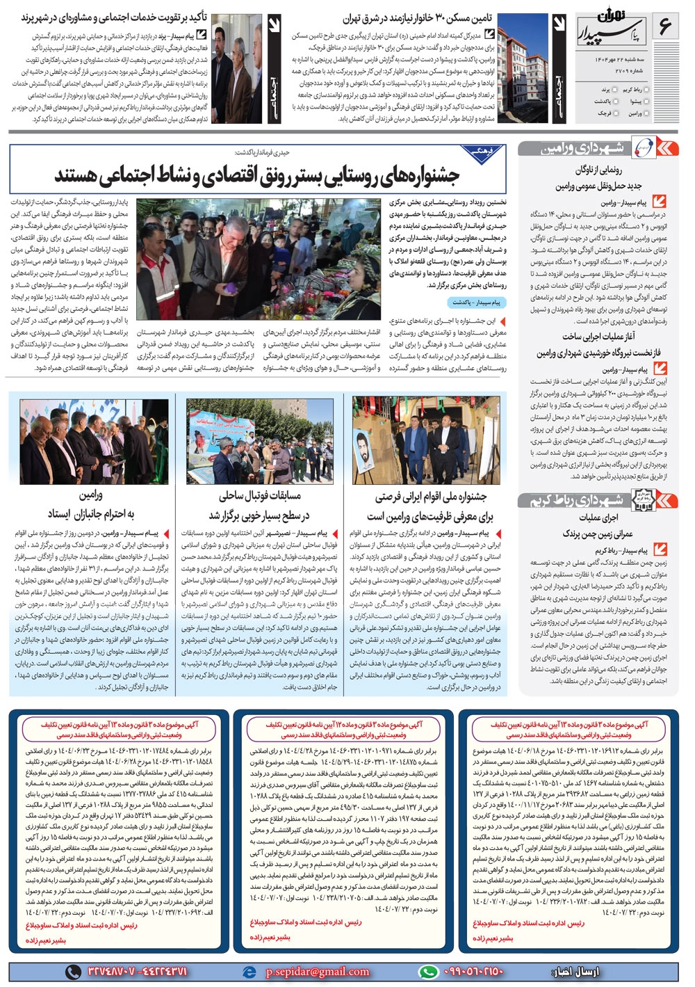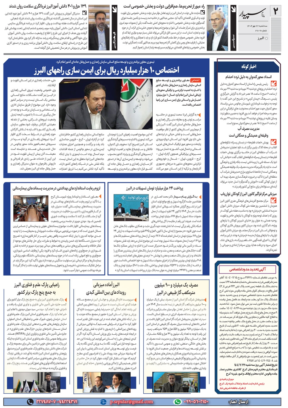 روزنامه پیام سپیدار شماره 2709 سه شنبه بیست و دوم مهر سال هزارو چهارصدو چهار منتشر شد و در دسترس مخاطبین قرار گرفت. روزنامه پیام سپیدار را می توانید از کیوسک های مطبوعاتی سطح شهر تهیه کنید.