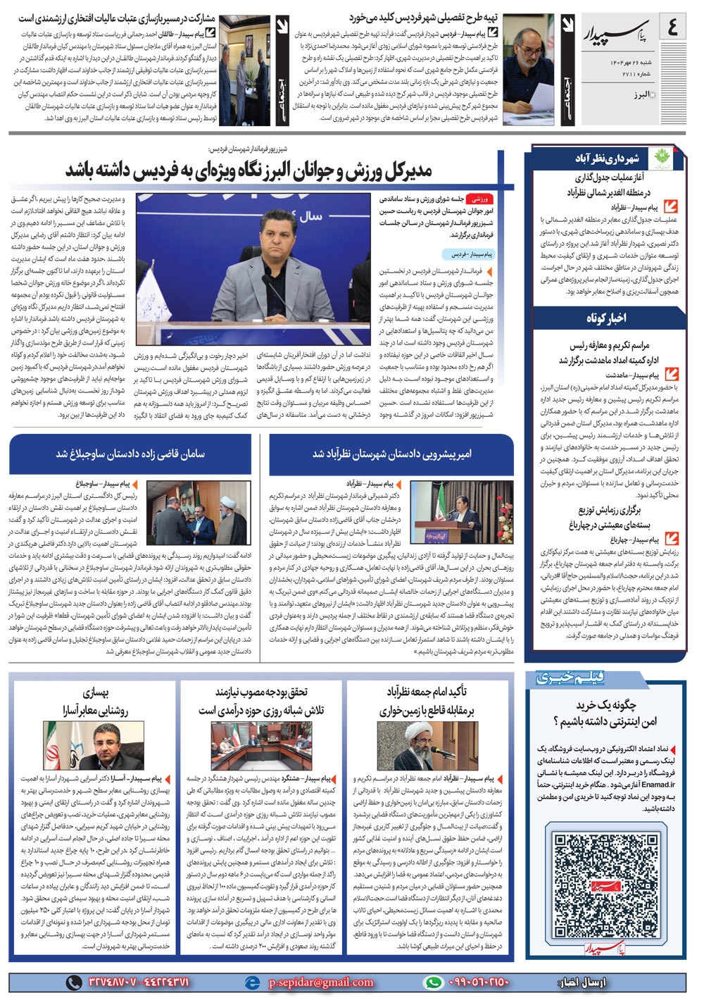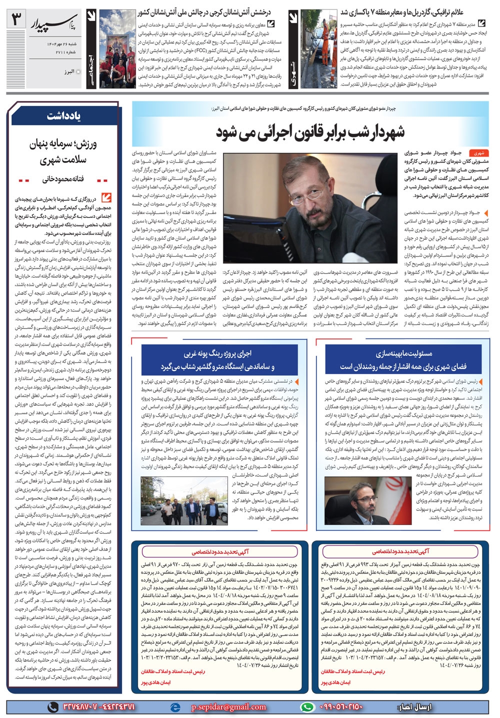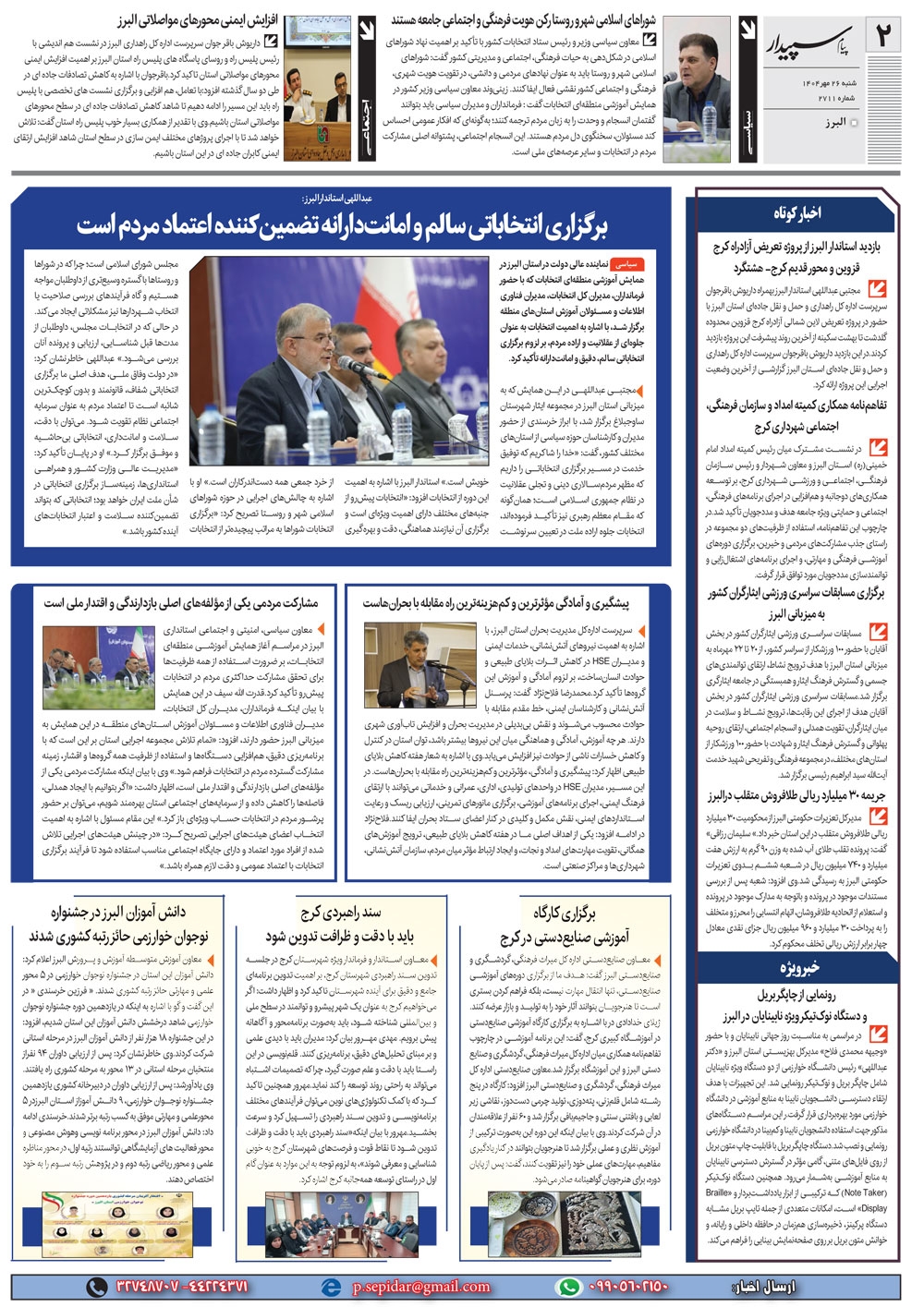 روزنامه پیام سپیدار شماره 2711 شنبه بیست و ششم مهر سال هزارو چهارصدو چهار منتشر شد و در دسترس مخاطبین قرار گرفت. روزنامه پیام سپیدار را می توانید از کیوسک های مطبوعاتی سطح شهر تهیه کنید.