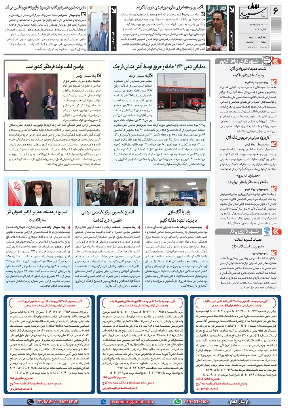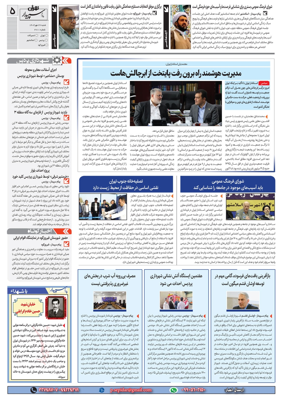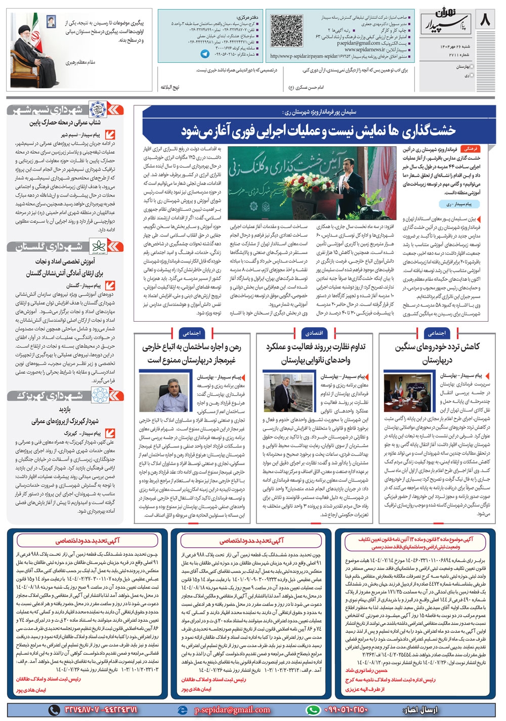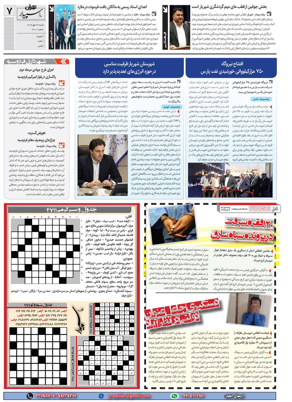 روزنامه پیام سپیدار شماره 2711 شنبه بیست و ششم مهر سال هزارو چهارصدو چهار منتشر شد و در دسترس مخاطبین قرار گرفت. روزنامه پیام سپیدار را می توانید از کیوسک های مطبوعاتی سطح شهر تهیه کنید.