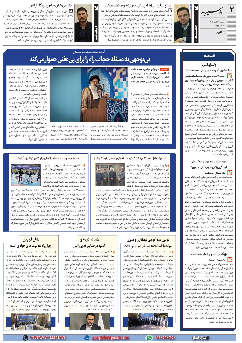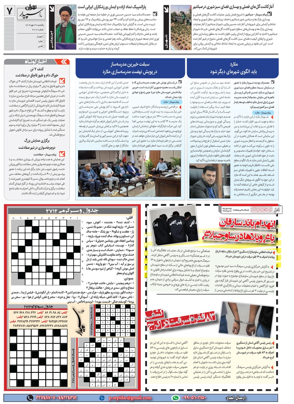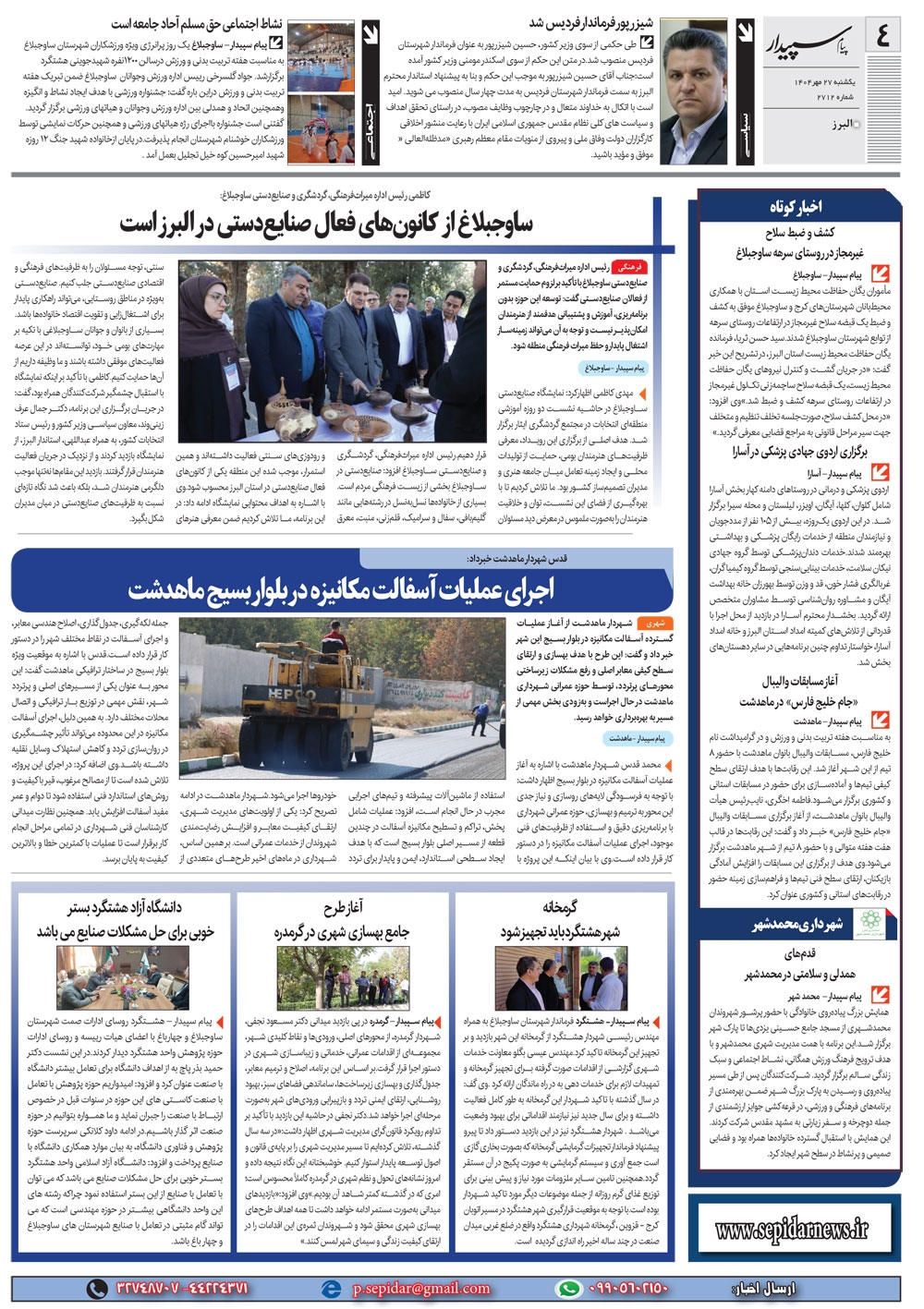روزنامه پیام سپیدار شماره 2712 یکشنبه بیست و هفتم مهر سال هزارو چهارصدو چهار منتشر شد و در دسترس مخاطبین قرار گرفت. روزنامه پیام سپیدار را می توانید از کیوسک های مطبوعاتی سطح شهر تهیه کنید.