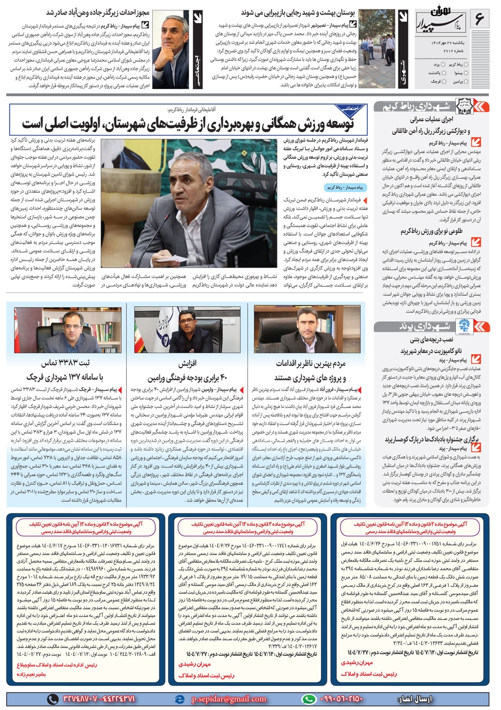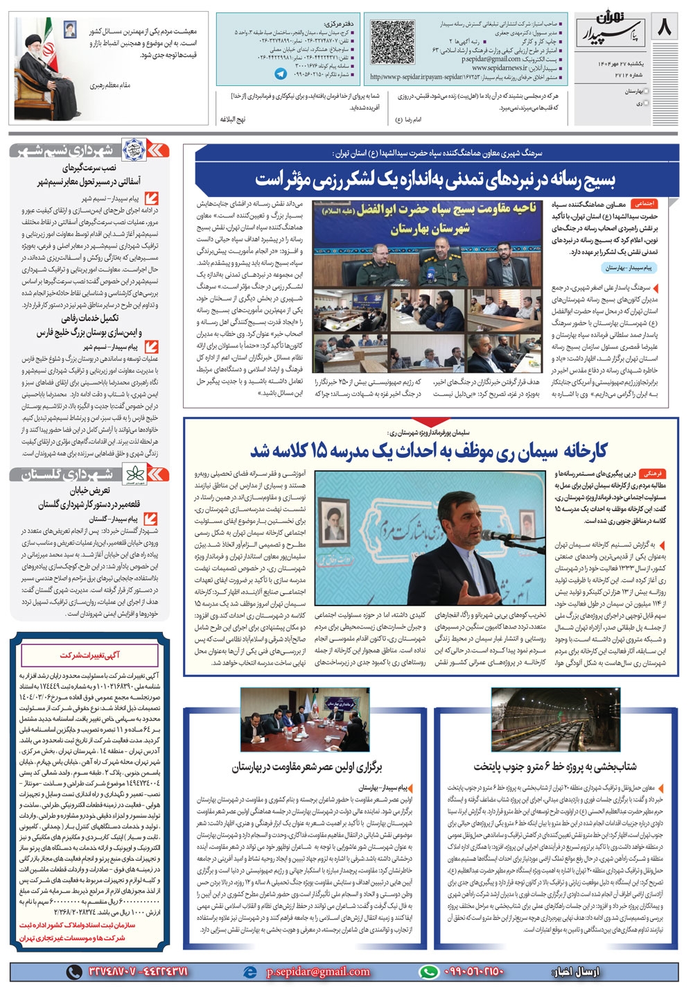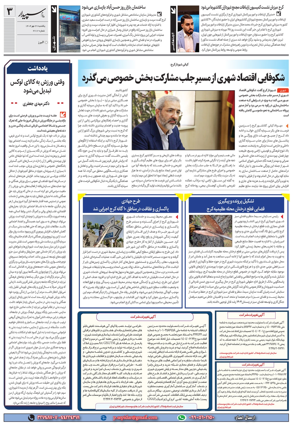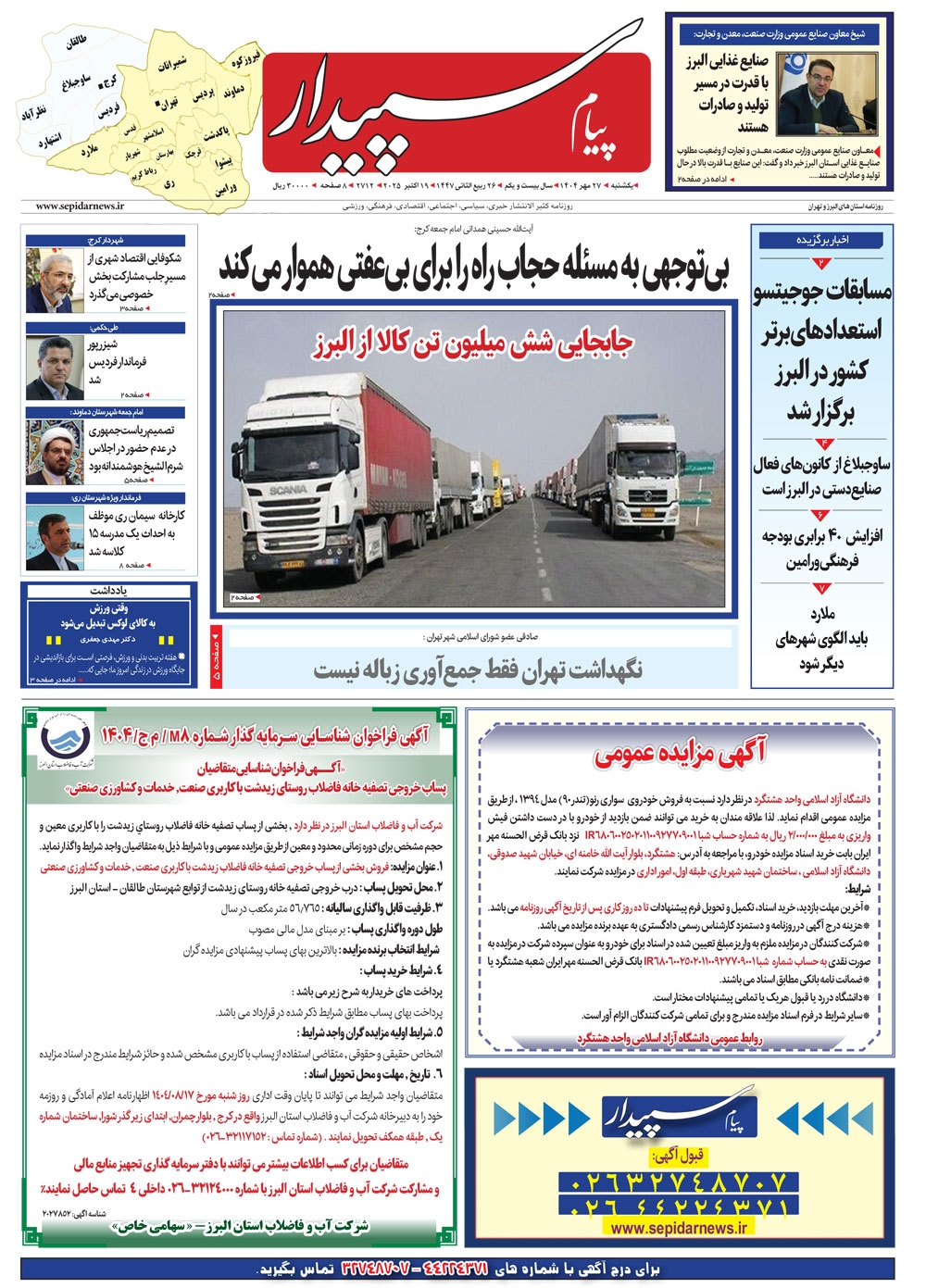 روزنامه پیام سپیدار شماره 2712 یکشنبه بیست و هفتم مهر سال هزارو چهارصدو چهار منتشر شد و در دسترس مخاطبین قرار گرفت. روزنامه پیام سپیدار را می توانید از کیوسک های مطبوعاتی سطح شهر تهیه کنید.