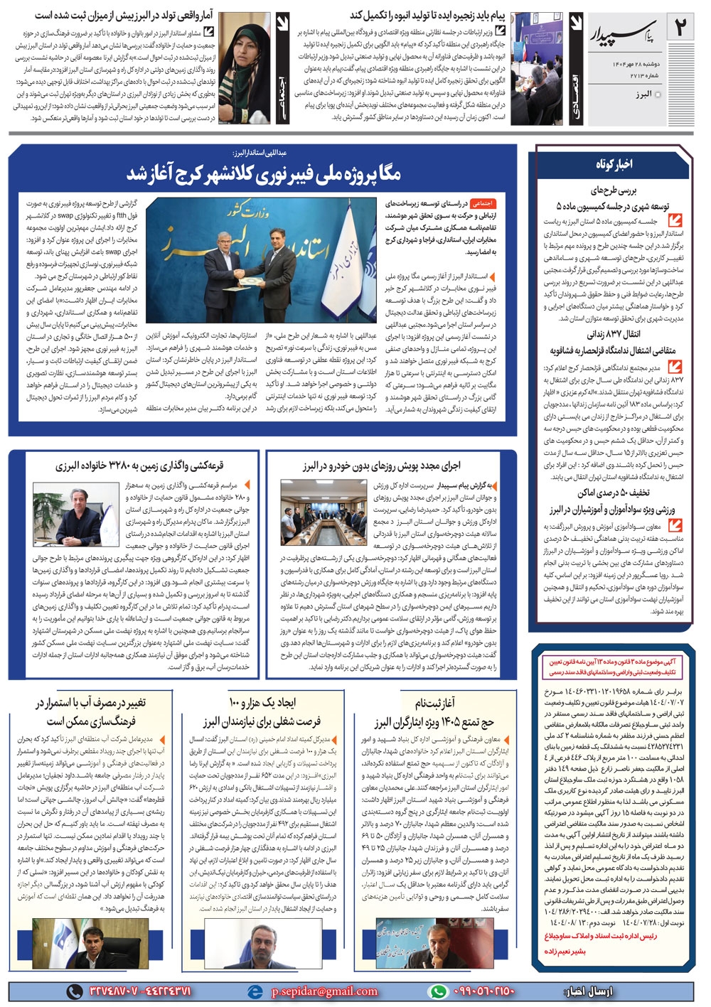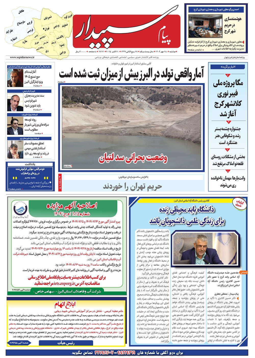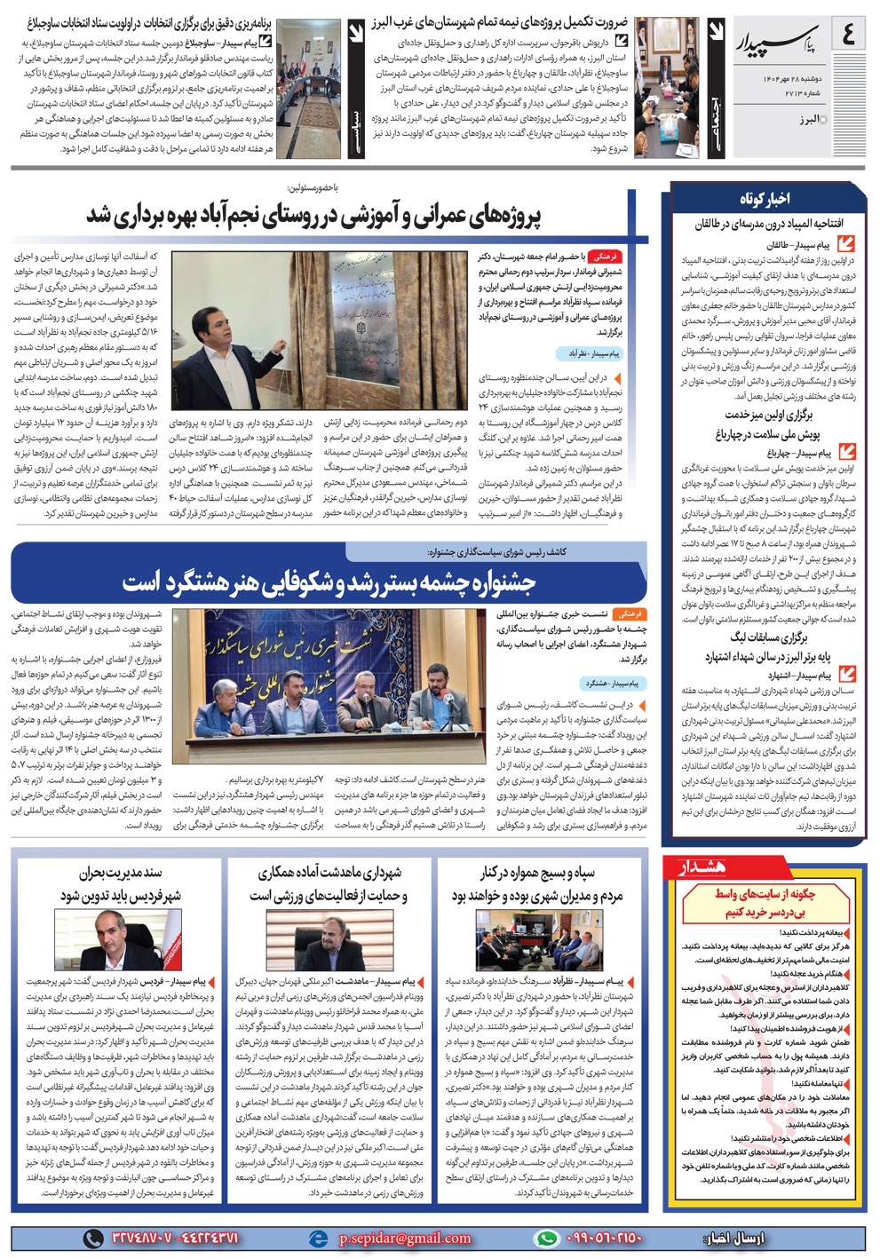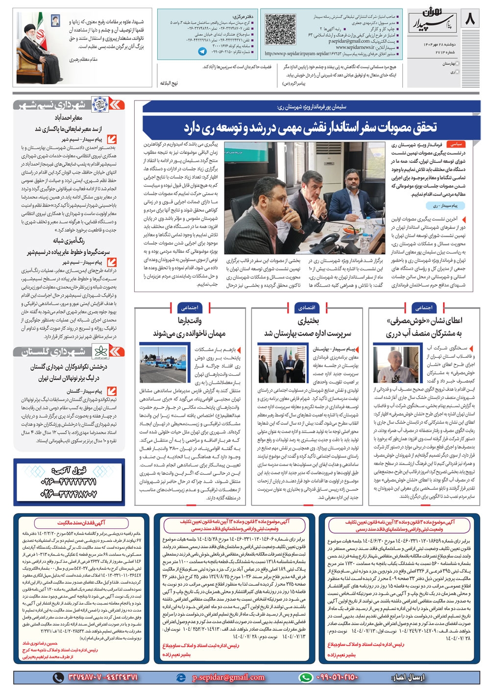 روزنامه پیام سپیدار شماره 2713 دوشنبه بیست و هشتم مهر سال هزارو چهارصدو چهار منتشر شد و در دسترس مخاطبین قرار گرفت. روزنامه پیام سپیدار را می توانید از کیوسک های مطبوعاتی سطح شهر تهیه کنید.