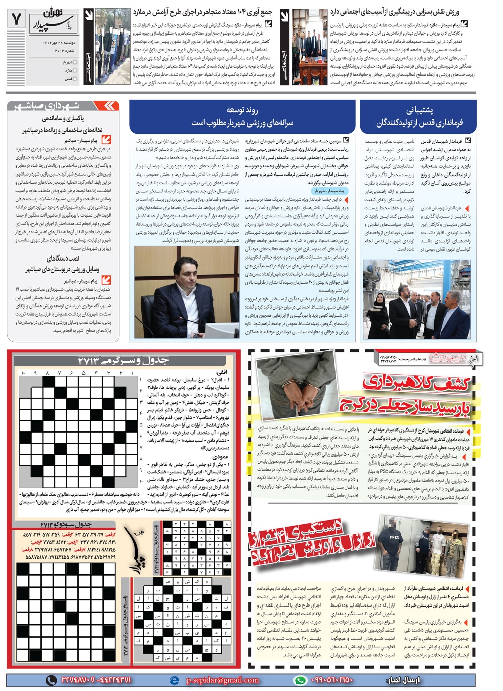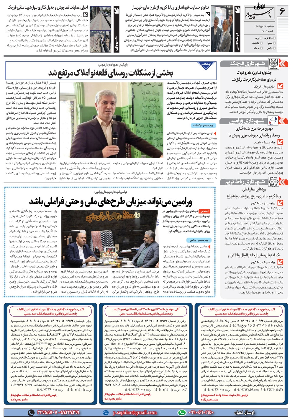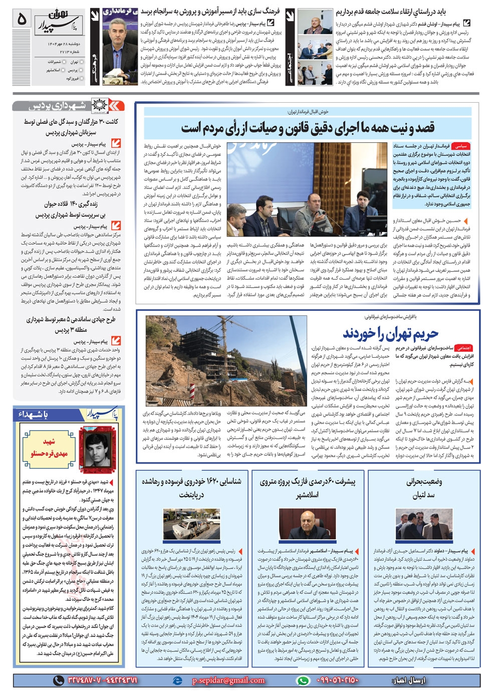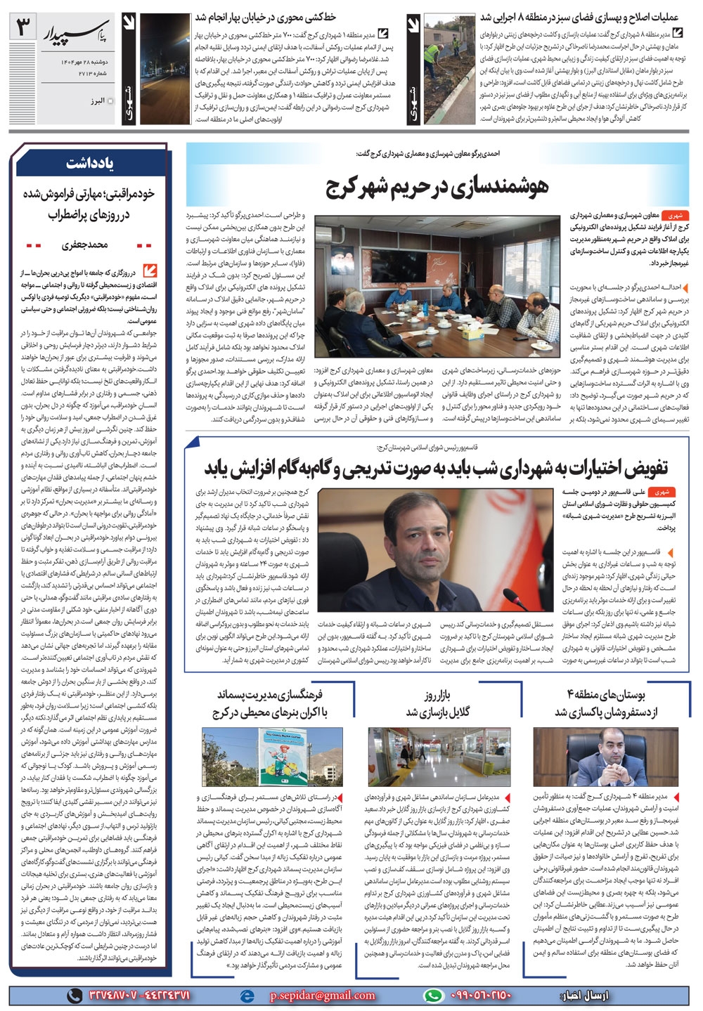 روزنامه پیام سپیدار شماره 2713 دوشنبه بیست و هشتم مهر سال هزارو چهارصدو چهار منتشر شد و در دسترس مخاطبین قرار گرفت. روزنامه پیام سپیدار را می توانید از کیوسک های مطبوعاتی سطح شهر تهیه کنید.