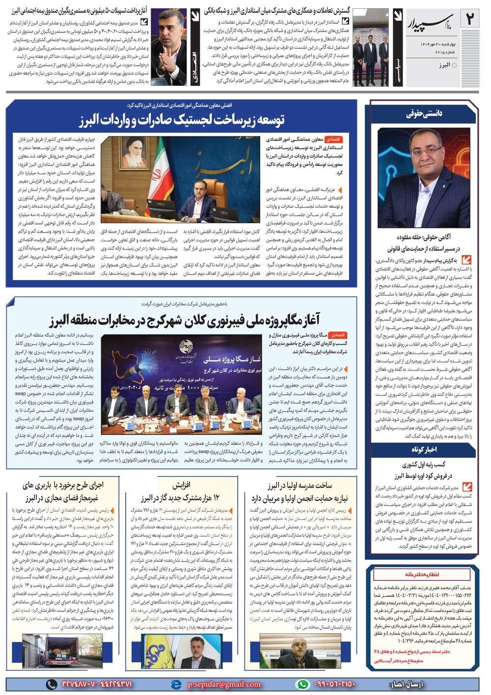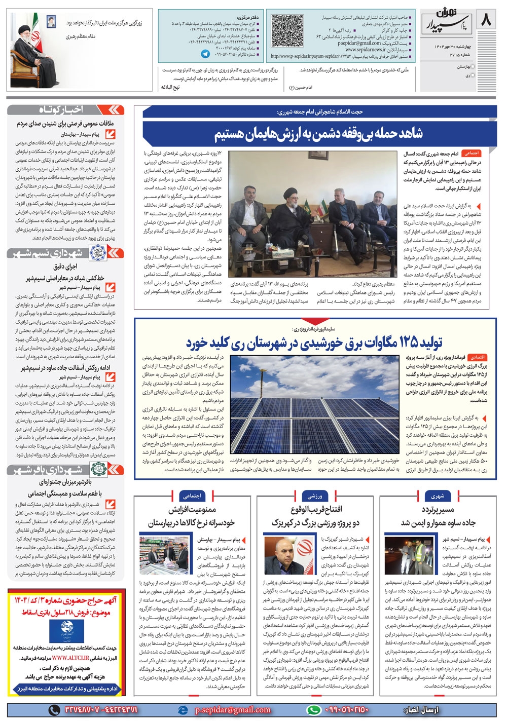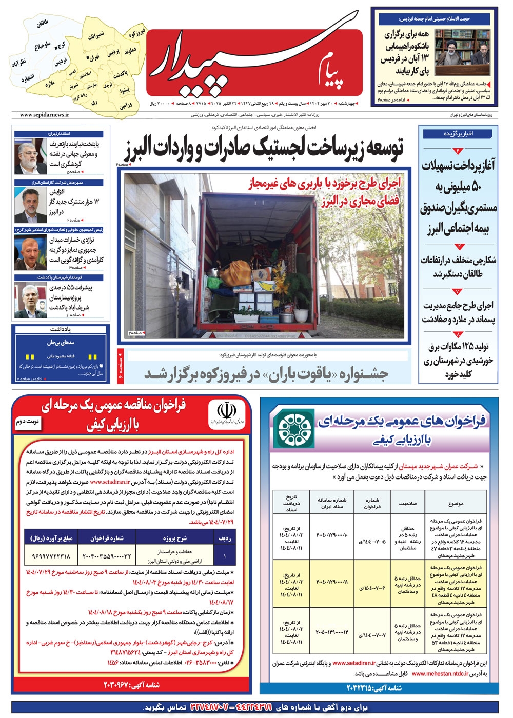 روزنامه پیام سپیدار شماره 2715 چهارشنبه سی ام مهر سال هزارو چهارصدو چهار منتشر شد و در دسترس مخاطبین قرار گرفت. روزنامه پیام سپیدار را می توانید از کیوسک های مطبوعاتی سطح شهر تهیه کنید.