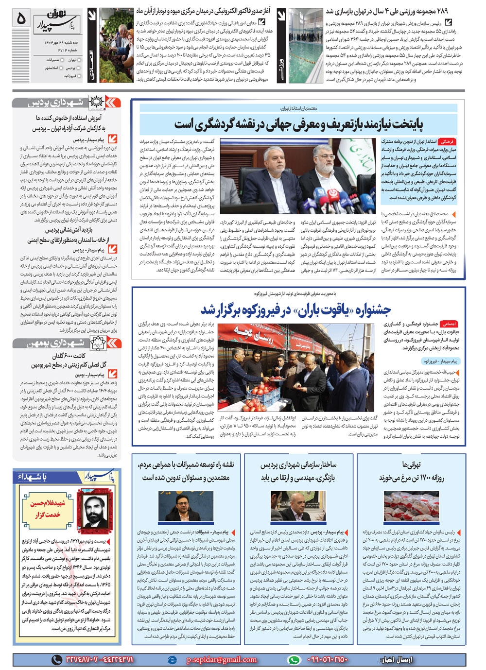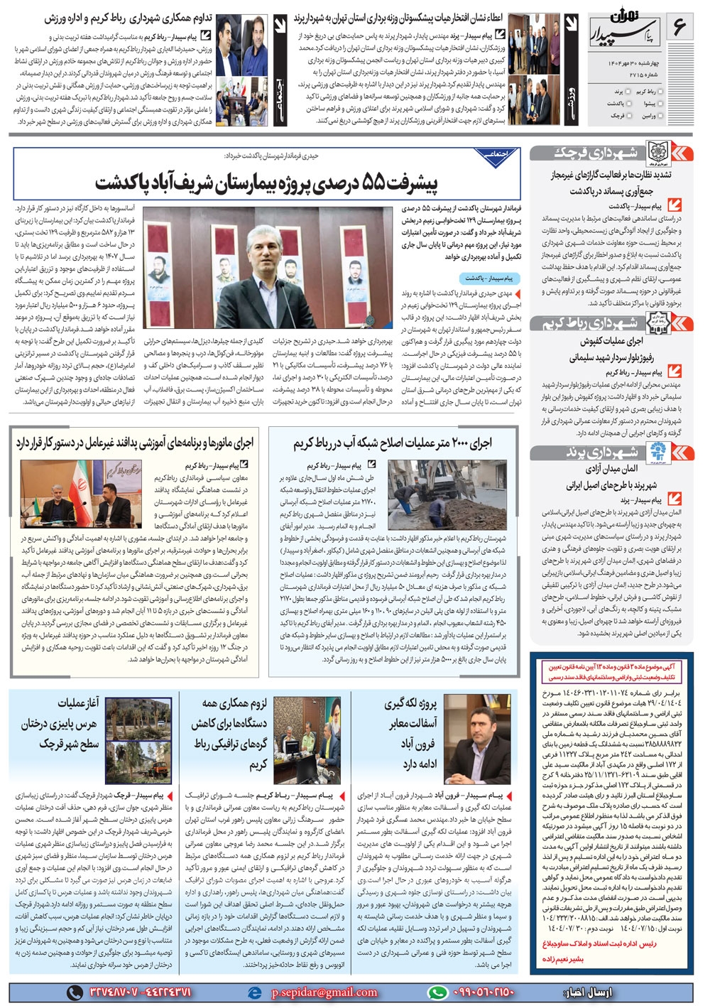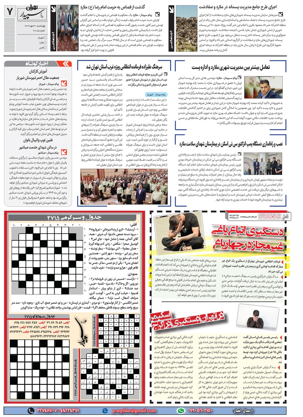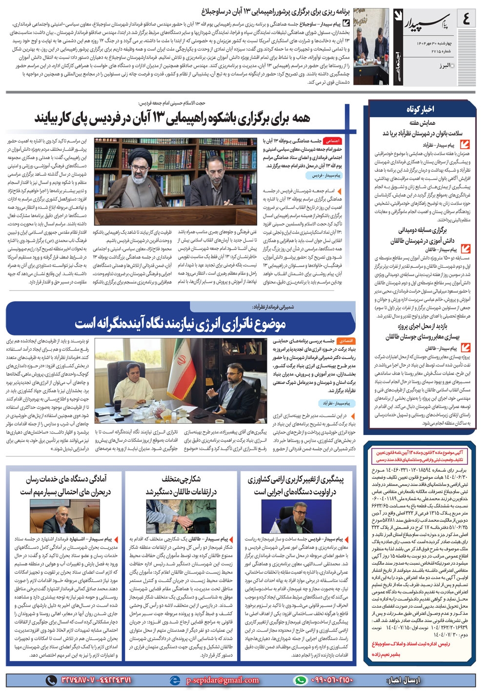 روزنامه پیام سپیدار شماره 2715 چهارشنبه سی ام مهر سال هزارو چهارصدو چهار منتشر شد و در دسترس مخاطبین قرار گرفت. روزنامه پیام سپیدار را می توانید از کیوسک های مطبوعاتی سطح شهر تهیه کنید.