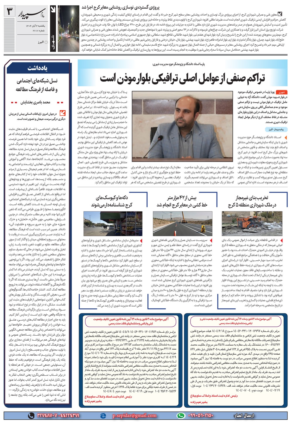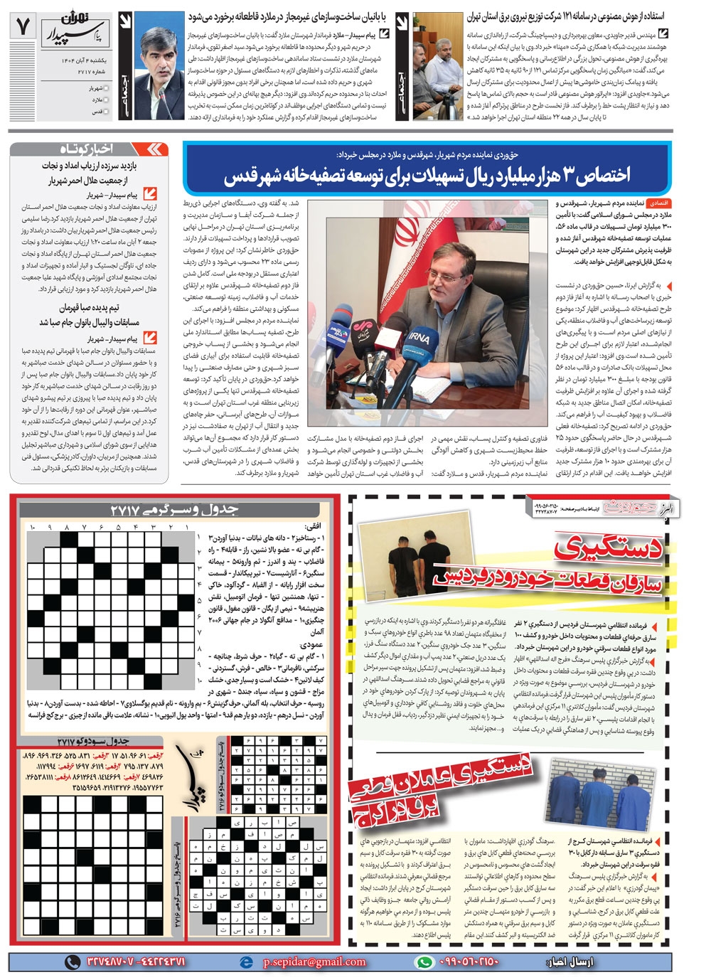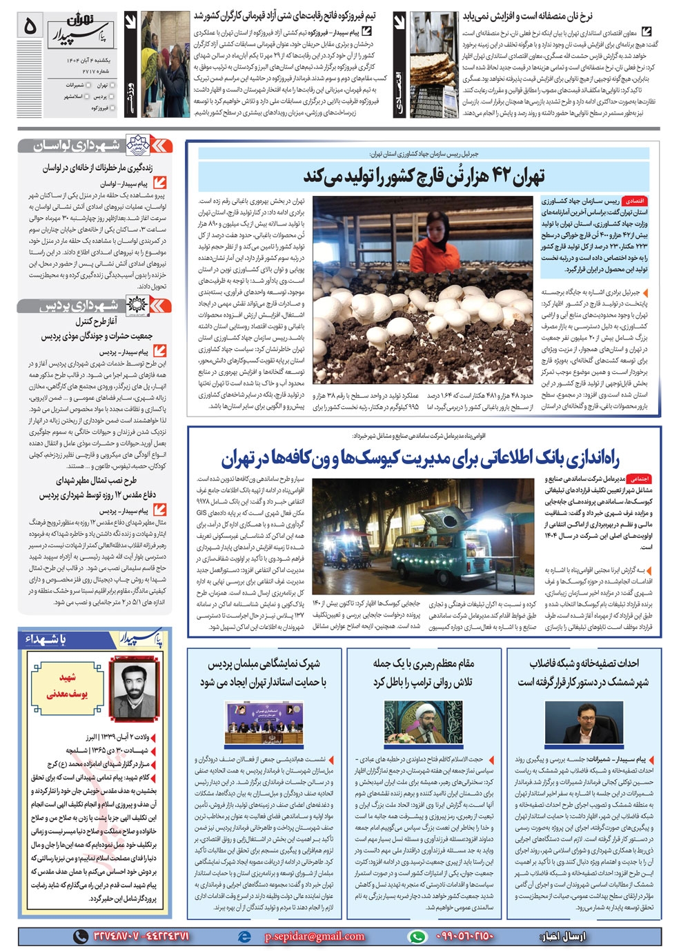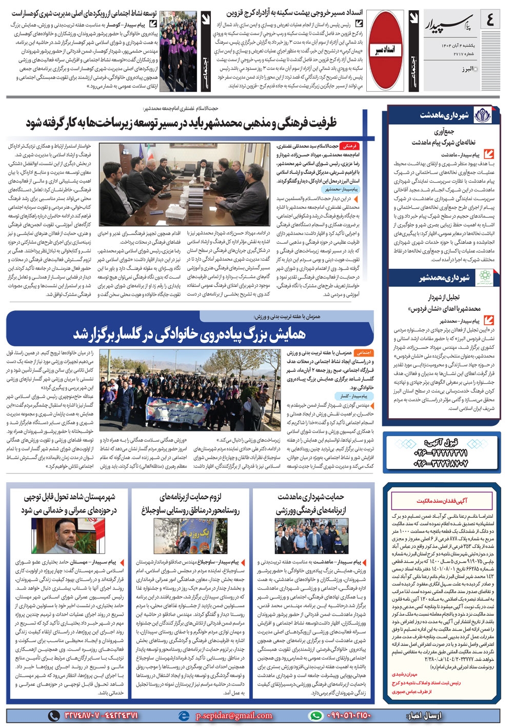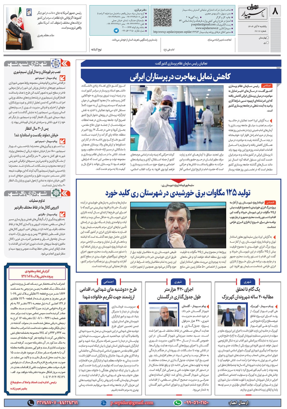 روزنامه پیام سپیدار شماره 2717 یکشنبه چهارم آبان سال هزارو چهارصدو چهار منتشر شد و در دسترس مخاطبین قرار گرفت. روزنامه پیام سپیدار را می توانید از کیوسک های مطبوعاتی سطح شهر تهیه کنید.