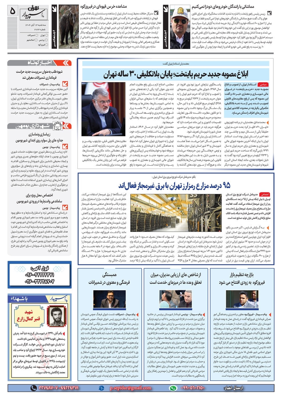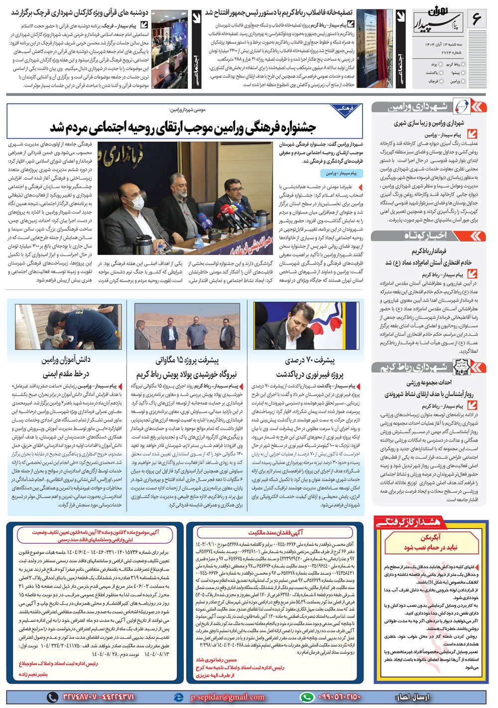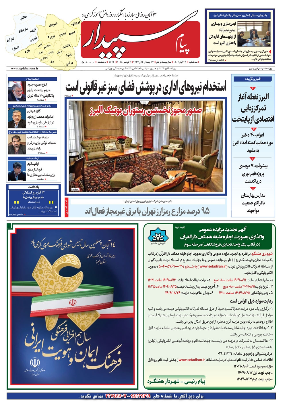 روزنامه پیام سپیدار شماره 2724 سه شنبه سیزدهم آبان سال هزارو چهارصدو چهار منتشر شد و در دسترس مخاطبین قرار گرفت. روزنامه پیام سپیدار را می توانید از کیوسک های مطبوعاتی سطح شهر تهیه کنید.