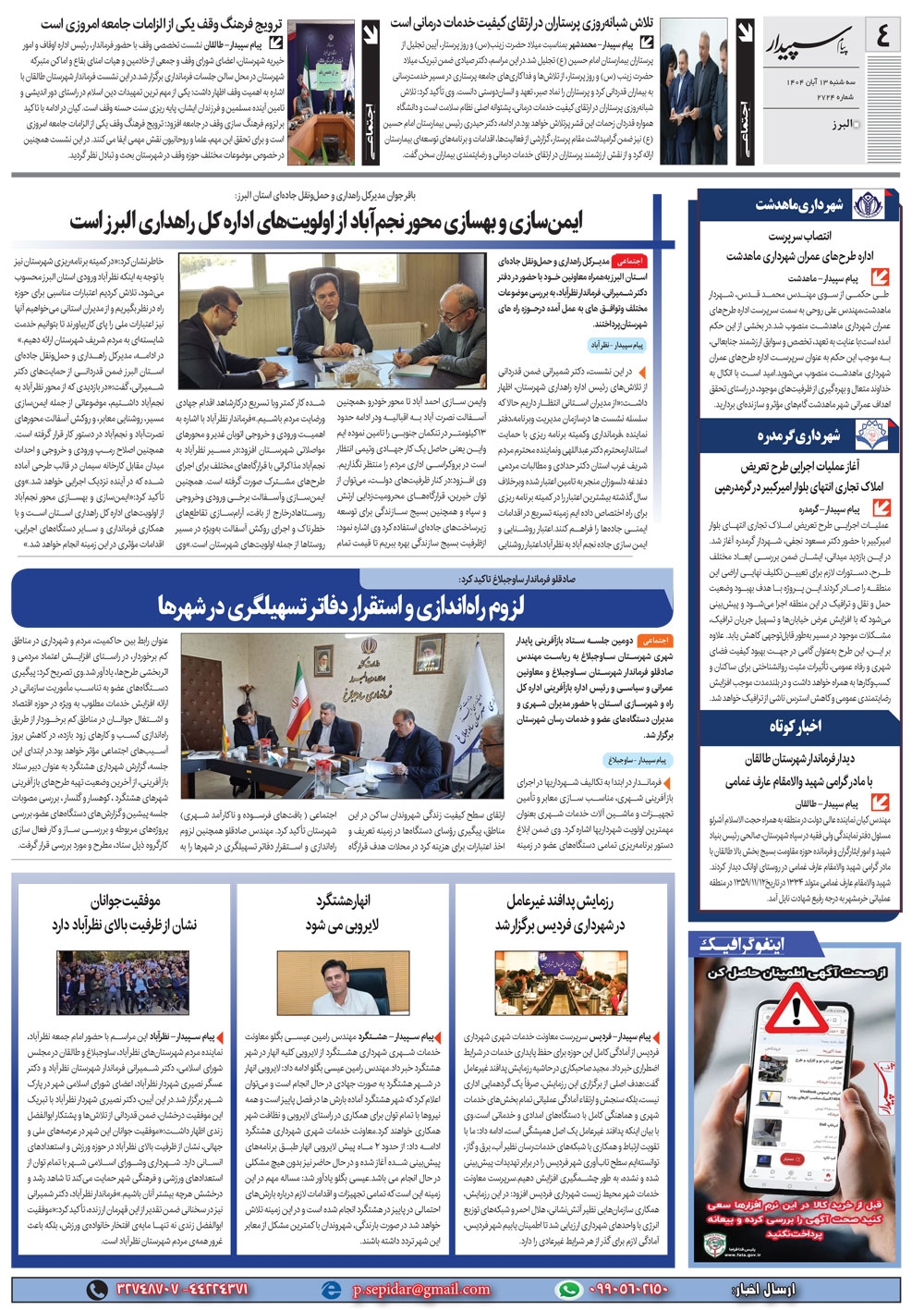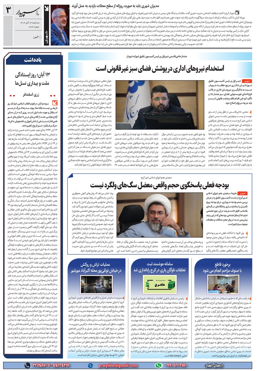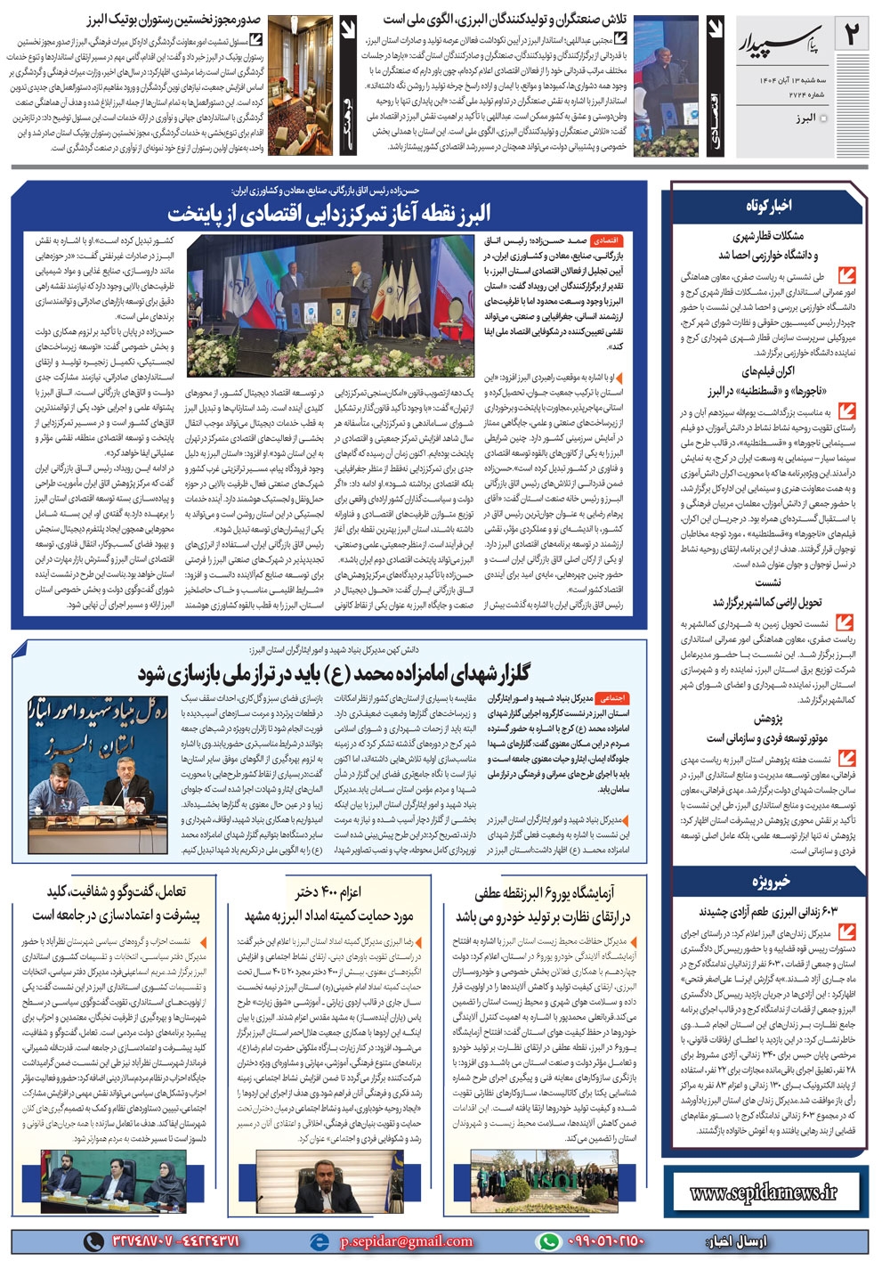 روزنامه پیام سپیدار شماره 2724 سه شنبه سیزدهم آبان سال هزارو چهارصدو چهار منتشر شد و در دسترس مخاطبین قرار گرفت. روزنامه پیام سپیدار را می توانید از کیوسک های مطبوعاتی سطح شهر تهیه کنید.